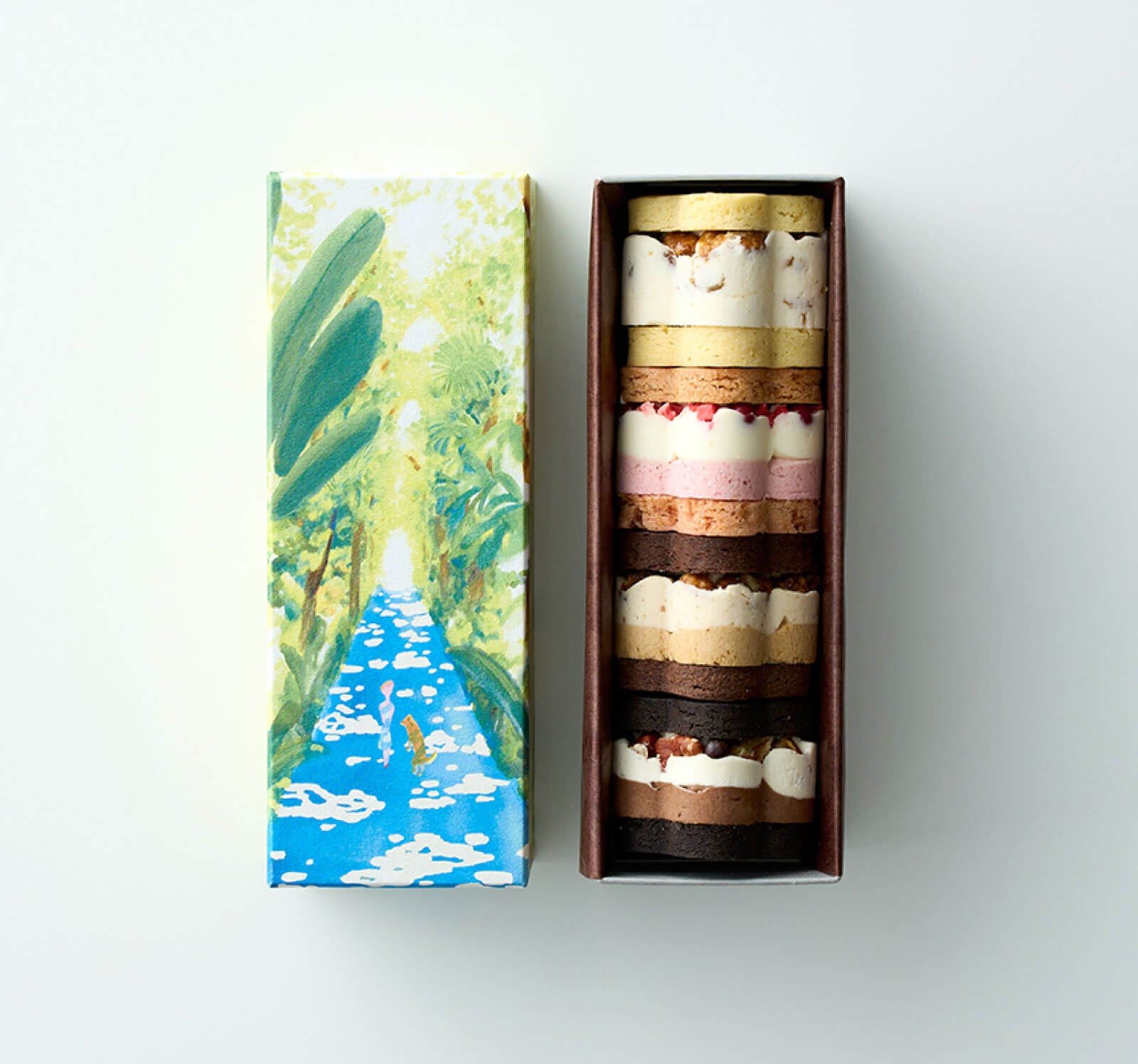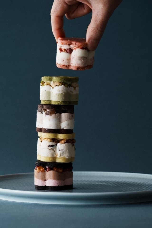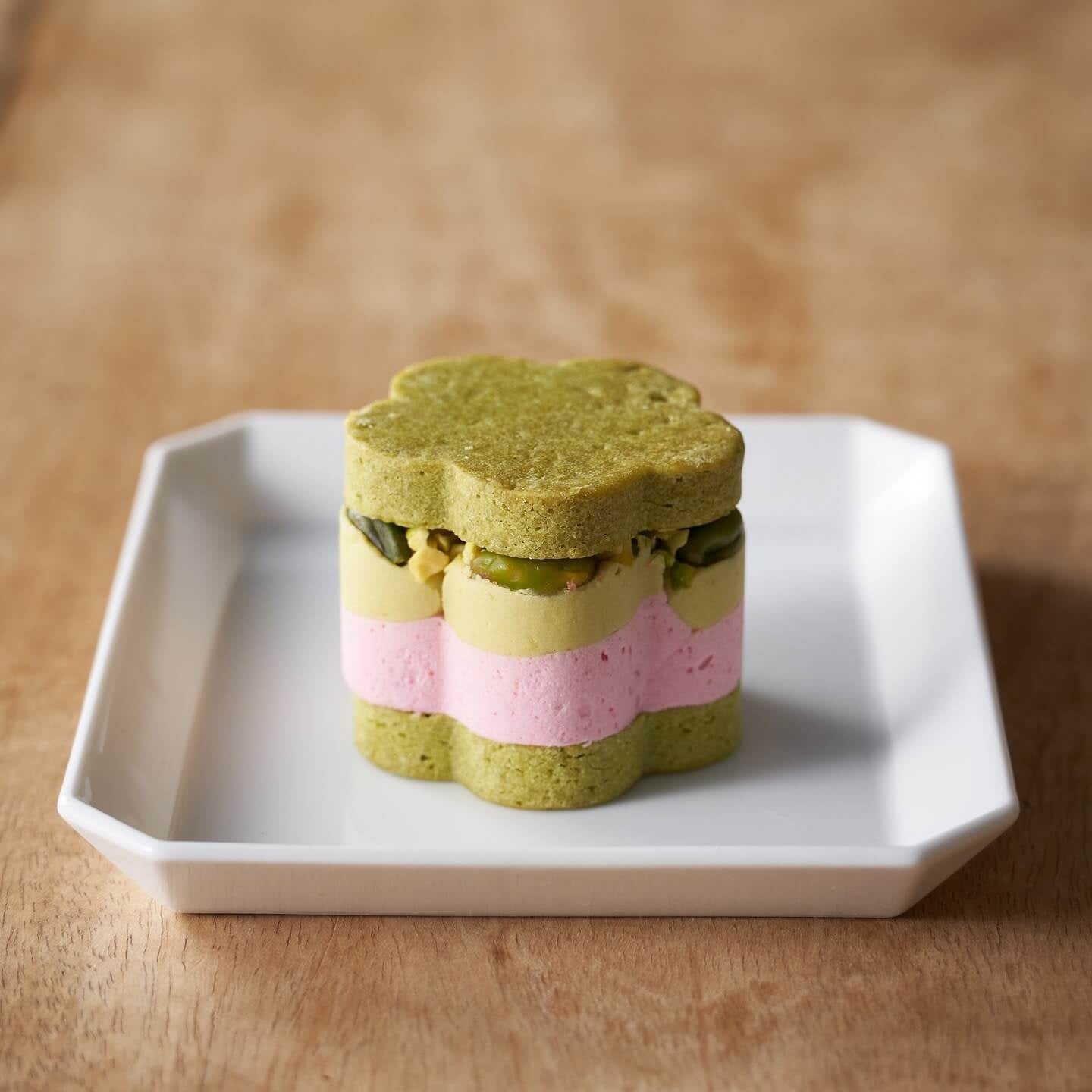 濃厚ピスタチオペーストを混ぜたクリームと甘酸っぱいラズベリーピューレを混ぜたクリームを重ねた上に、上質なピスタチオをトッピングしピスタチオを練りこんだサブレでサンドしました。