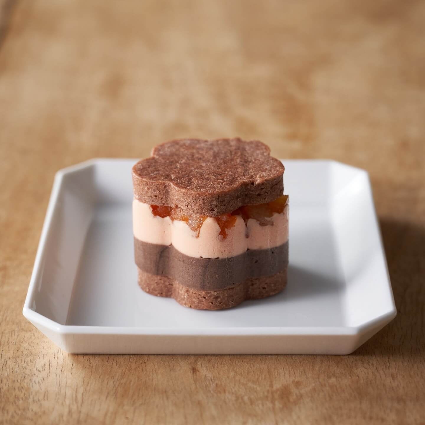 ブラッドオレンジとビターチョコを練りこんだ2層仕立てのバタークリームの中にキャラメリゼしたヘーゼルナッツを忍ばせ、グランマルニエでマリネしたオレンジピールをトッピング。ココアを練りこんだサブレでサンドしました。