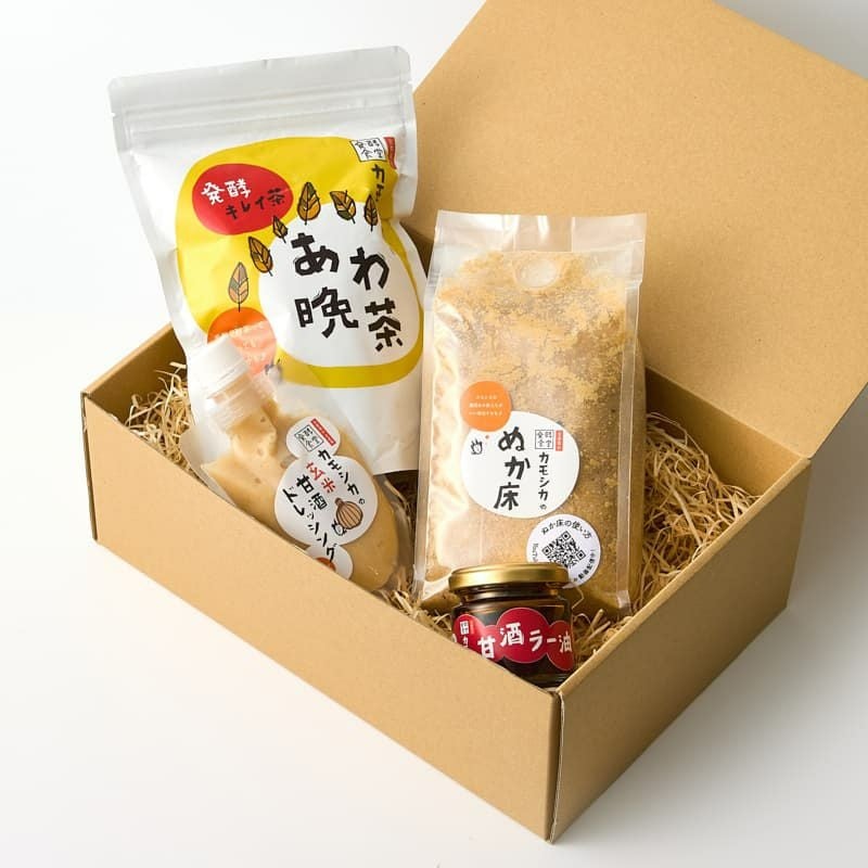 「発酵食堂カモシカ」の人気の発酵食も数多く販売しております。届いたその日からぬか漬けづくりがスタートできる簡単便利なぬか床をはじめ、自家製甘酒を使ったラー油やドレッシング、乳酸発酵させた徳島県伝統のあわ晩茶などバラエティ豊かに揃えています。美容や健康維持に欠かせない発酵食品は、おいしいだけでなく栄養もたっぷり。料理好きな方や、いつまでも健康でいてほしい大切な方への贈り物におすすめ。オンラインショップでは「発酵食品発酵食ギフトセット5,000円(税込)」も、販売しております。