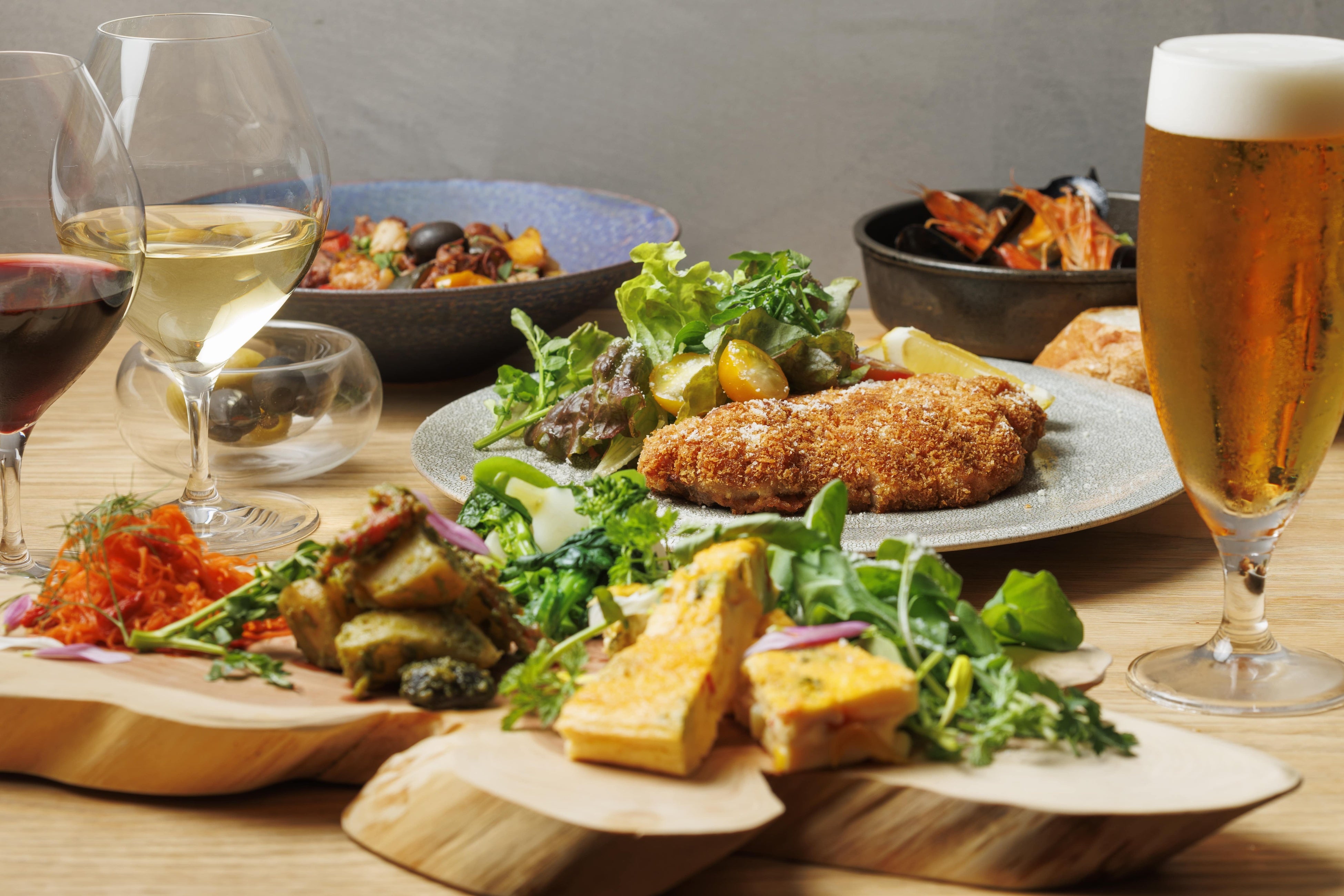 スペイン料理をベースに、スパイスやガーリックを効かせた、ビールによく合う暑い時期にぴったりなお料理をご用意。野菜をたっぷり使用した前菜を中心に仕上げた、彩り豊かなアソートプレートから始まり、メインは生ハムと、とろけるチーズを一緒にフライした、ポークカツレツ。食べ応え抜群のお料理と、ビールやワインなどアルコール各種のフリードリンク90分制付きです。緑溢れる吹き抜けが気持ちいいテラス席か、中庭が見渡せる涼しい店内のガーデンビュー席、お好きなお席で会の喧騒を忘れられる時間をお過ごしいただけます。