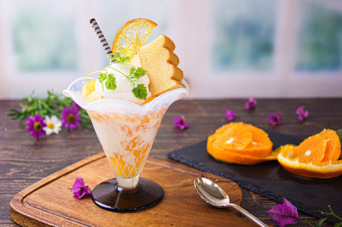 トッピングには、濃厚な甘さとまろやかな口当たりでファンが多い古賀の井スイーツの代名詞「Premiumミルクジェラート」をワンスクープ乗せるとともに、オレンジセックやバウムクーヘンを使用。様々な食感と共に柑橘とミルクのハーモニーをお楽しみいただける一品に仕上げました。