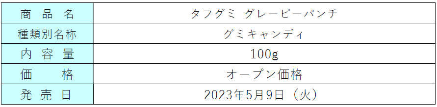 本商品は、クセになる高弾力食感とサワーパウダーが特長の「タフグミ」ブランドの新フレーバーです。パンチが効いた味わいがやみつきになる2種類のグレープ炭酸味を楽しめます。