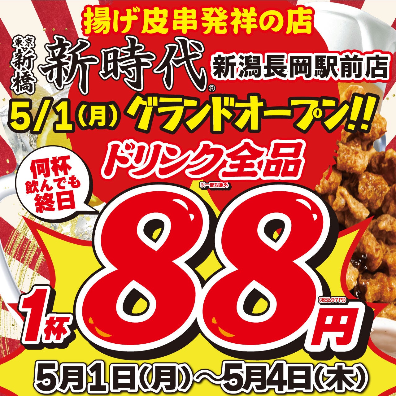 「新時代 新潟長岡駅前店」のオープンを記念し、ドリンク全品を1杯88円でお楽しみ頂けるキャンペーンを開催します。