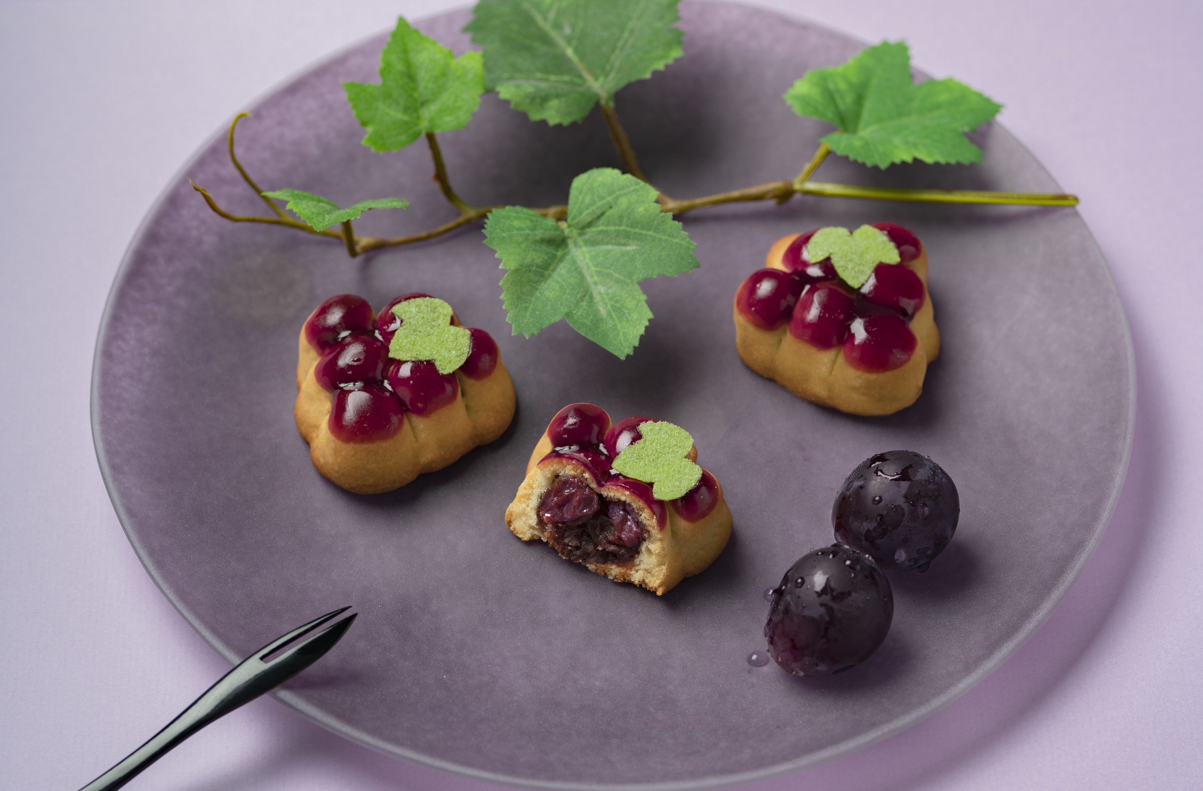 摘みたてのみずみずしさと最中の皮で作った葉をあしらい可愛い葡萄を表現いしました。