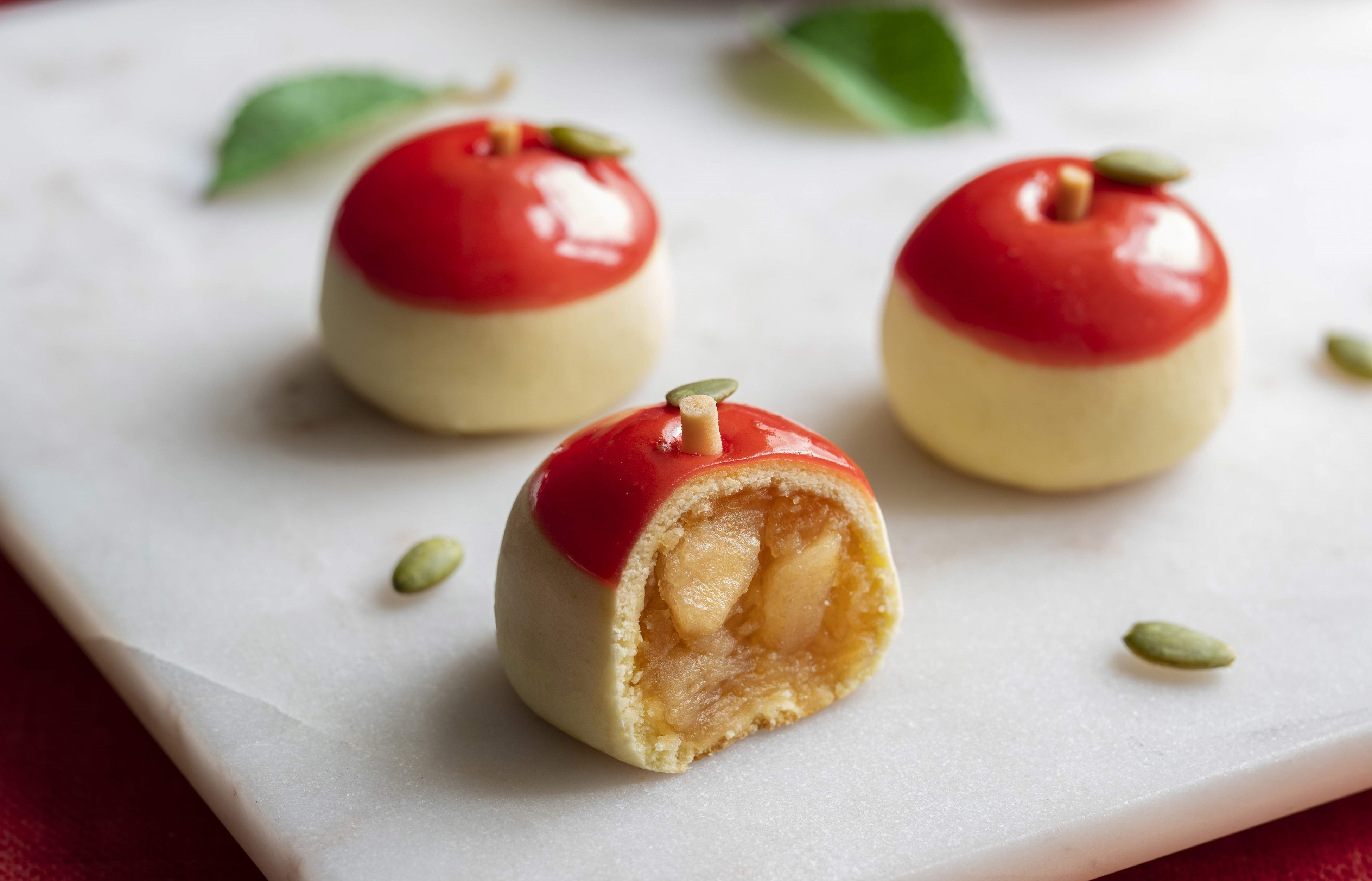 りんご餡を包むしっとり柔らかい林檎の形を表現した生地にもりんごの風味をつけることで、口に入れた瞬間にまるでりんごを丸ごと食べているかのような風味を感じます。