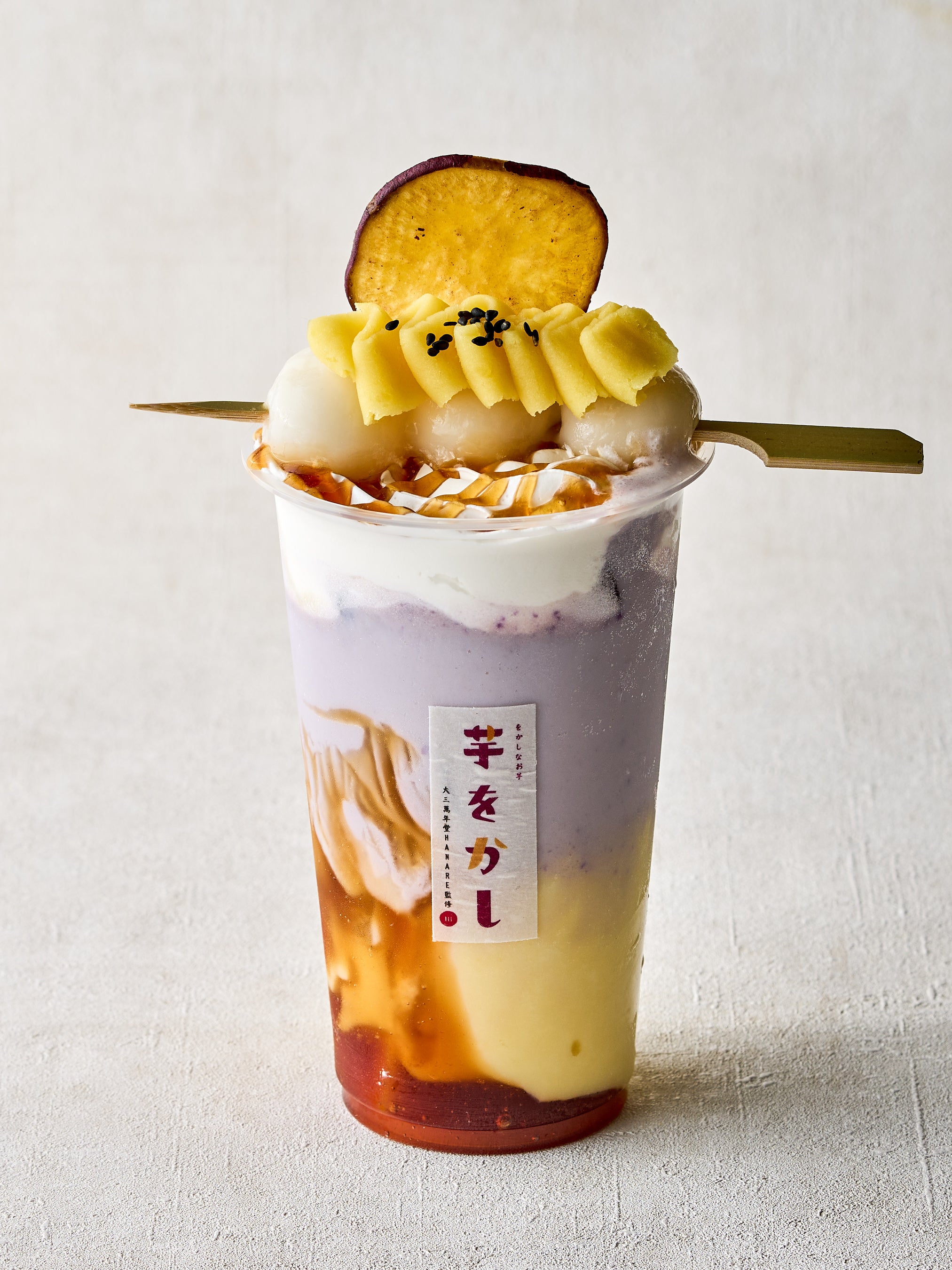 「黄芋」と「紫芋」の2層がまるで夕日のように綺麗(をかし)で、芋と豆乳を合わせたまろやかな口当たり。ホイップクリームやみたらしソースとの相性も抜群です。