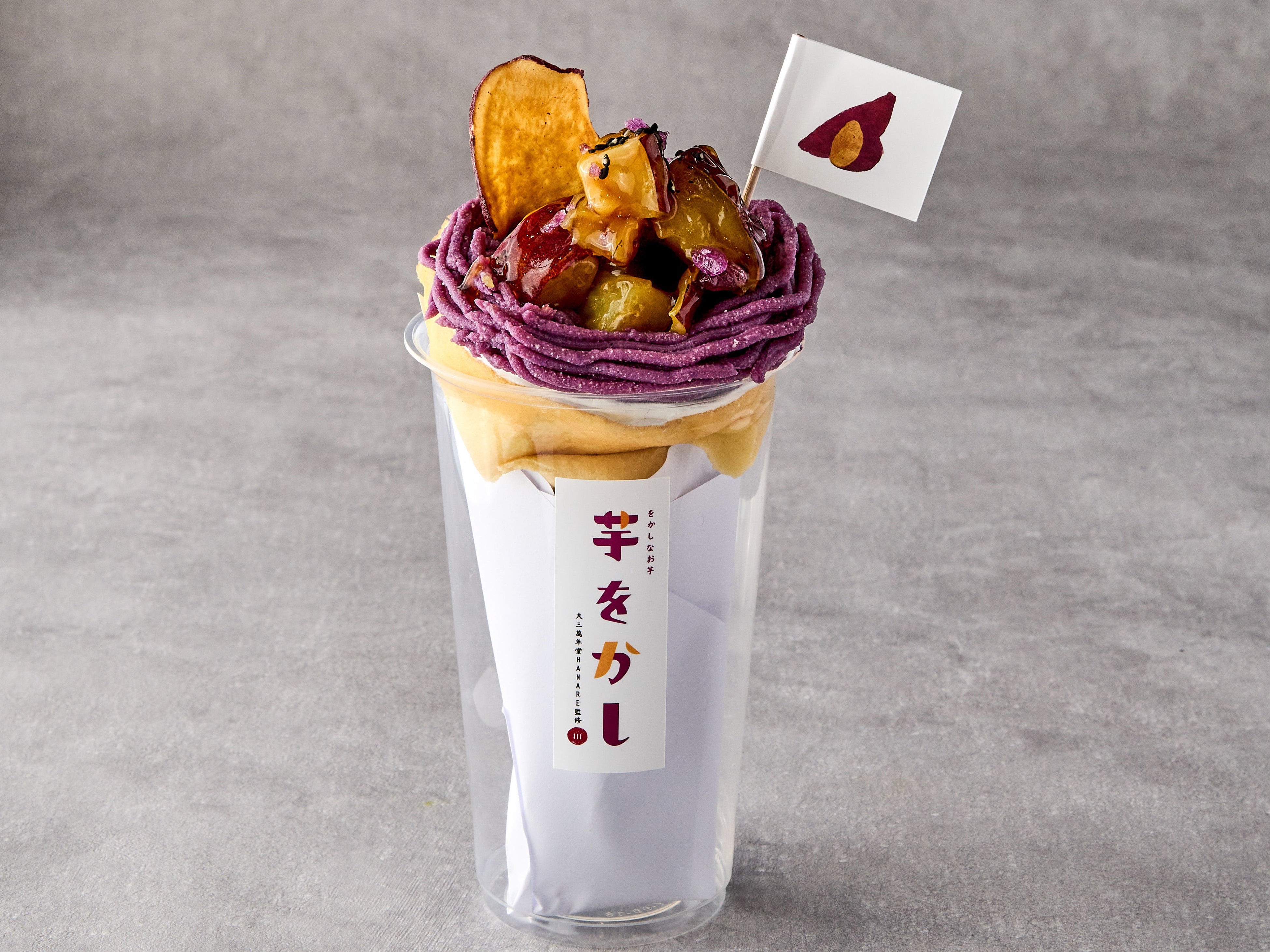 ベースのカップクレープの上に、国産の紫芋ペーストと生クリームをあわせたほっこり感のある紫芋クリームと、みたらしソースをからめた国産焼き芋をトッピング。食感のアクセントに昔ながらのパチパチ飴をトッピングして遊び心をプラス。お芋チップスも添えて見た目も華やかに仕上げました。