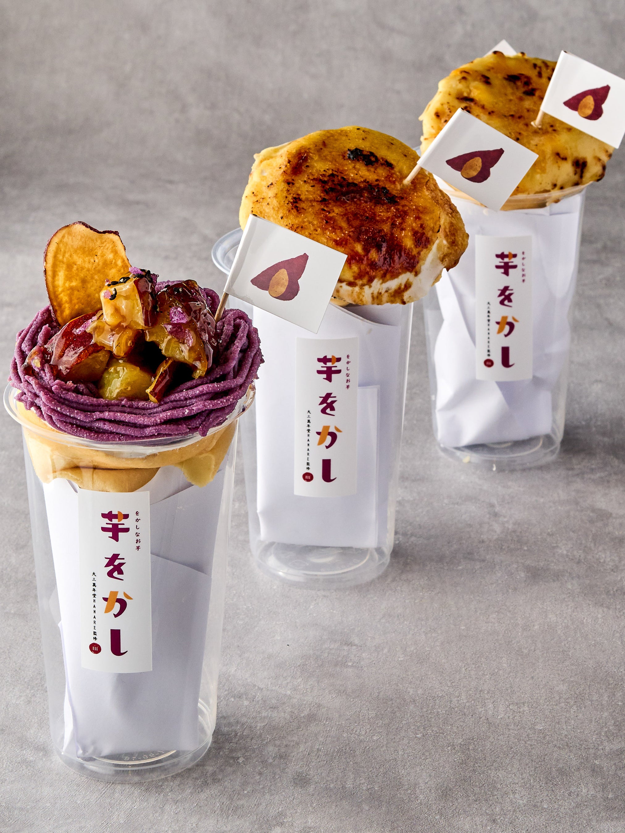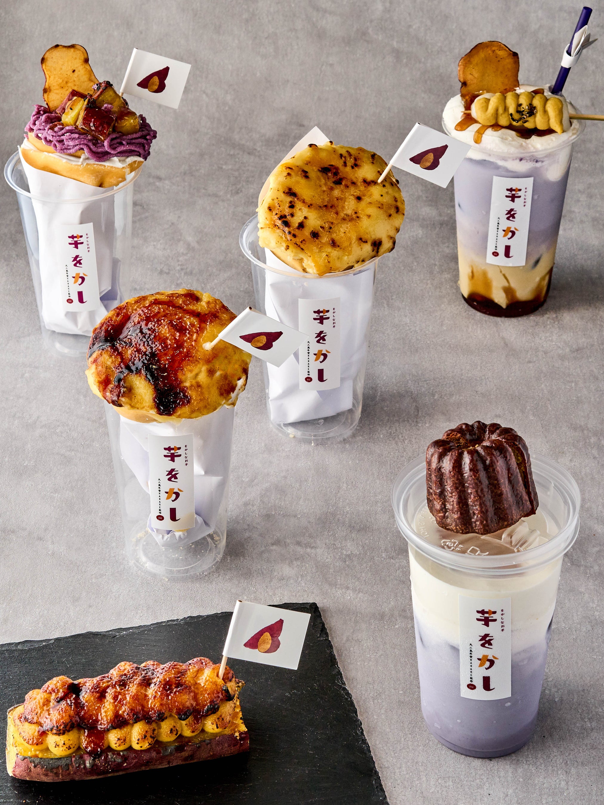 お芋とチーズの甘じょっぱさが絶妙な、新形態のカップ入りクレープ「ぽってり焼き芋のカップ de クレープ~クワトロフォルマッジ仕立て~」。販売以来大人気の「飲む焼き芋」をベースに進化した「ディップde焼き芋カヌレ」などをご用意しました!
