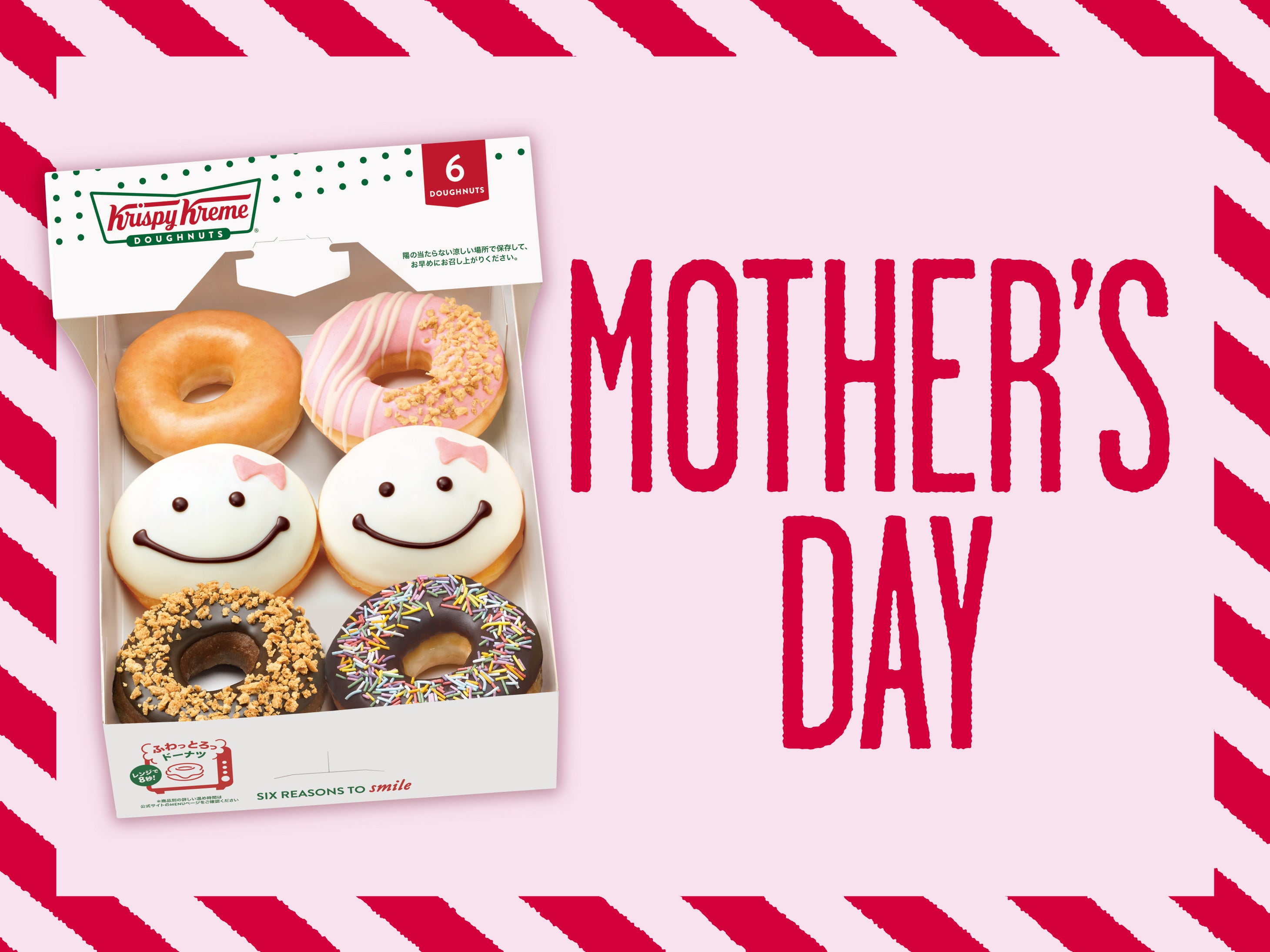 母の日に贈りたいママボックス。ママのスマイルをイメージしたママ カスタードに 定番のオリジナル・グレーズド®や、チョコやストロベリーのドーナツがつまった6個入り。