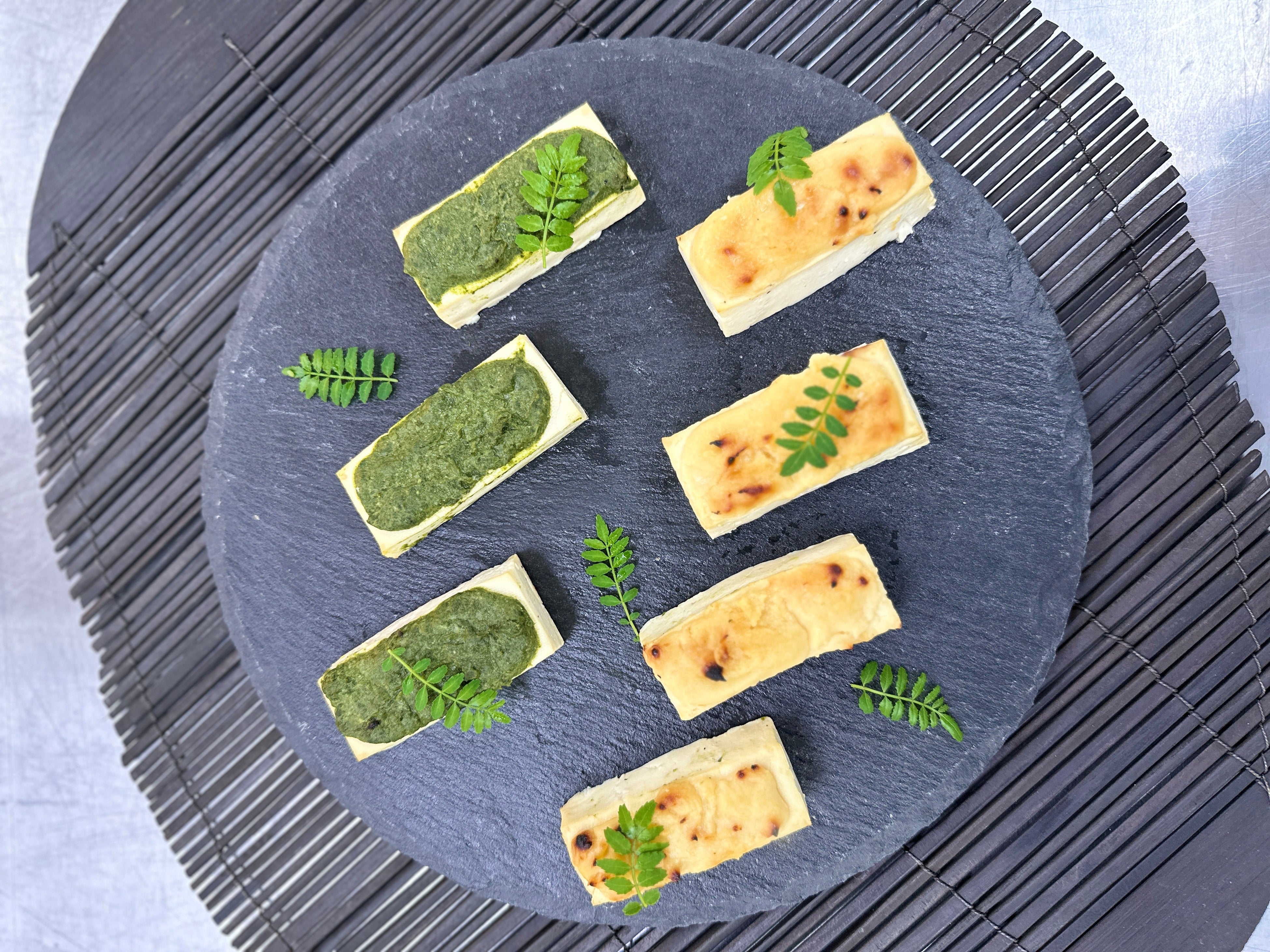 【宇治】京都の“石野味噌(白味噌)で作った上品な甘みの玉みそ”と、宇治緑茶に海苔の香りをアクセントにした”ヴェルデソース”を合わせて田楽に仕上げました。