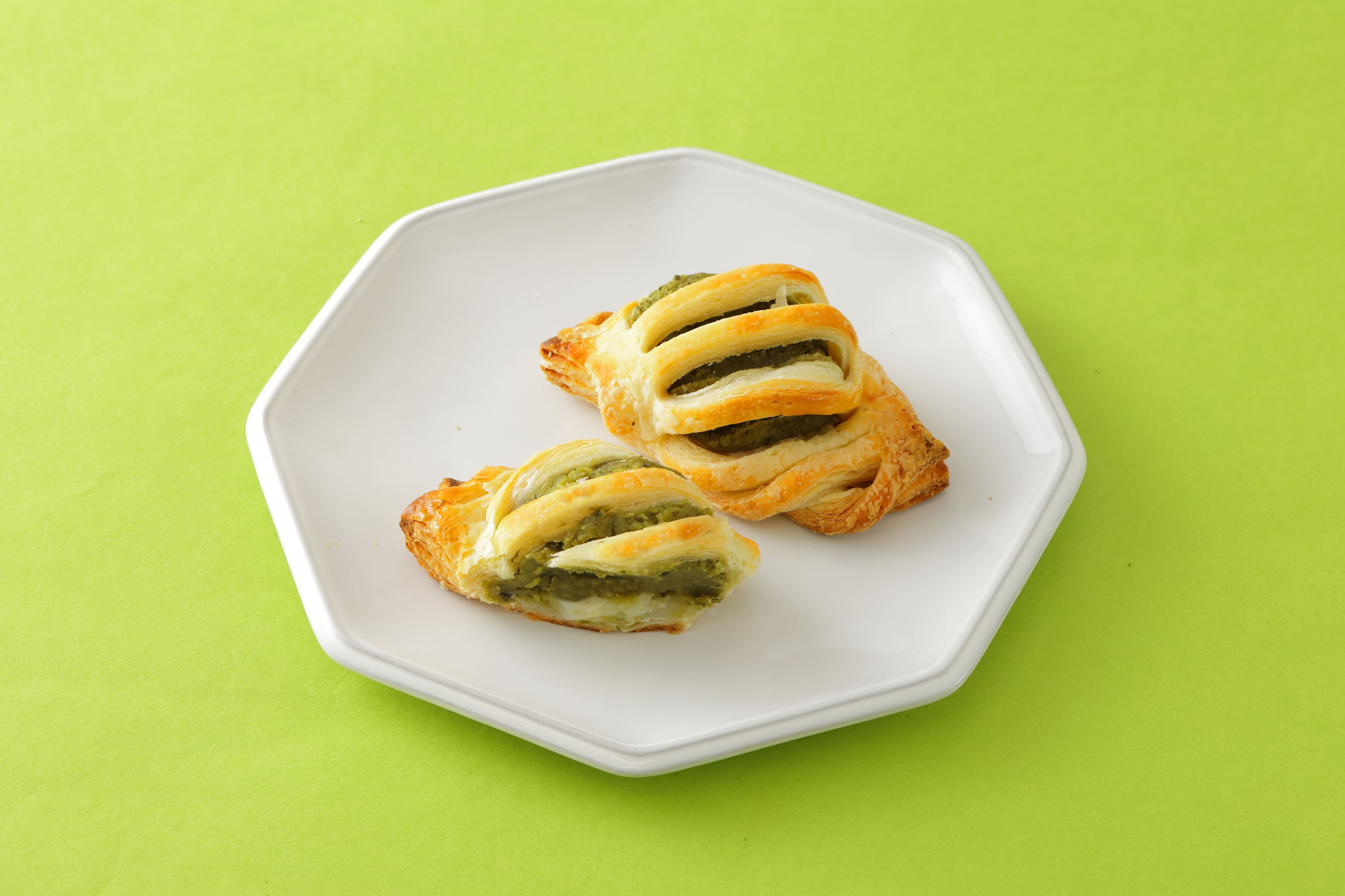 サクサクのパイ生地に抹茶あんと白玉を合わせました。サクサクともちもちの食感がお楽しみいただけます。