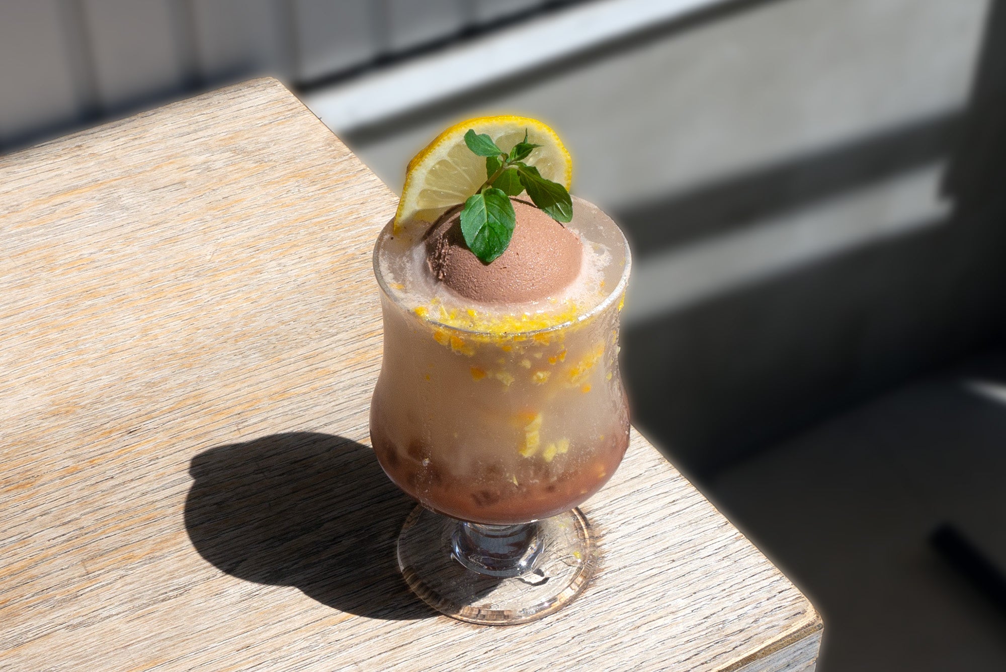 シュワっとした炭酸水に、甘さと酸味のバランスが取れた“オレンジコンフィ”、ナッツのようなフレーバーのプレミアムチョコレートアイスクリームをトッピングし、アクセントにレモンとミントを添えています。