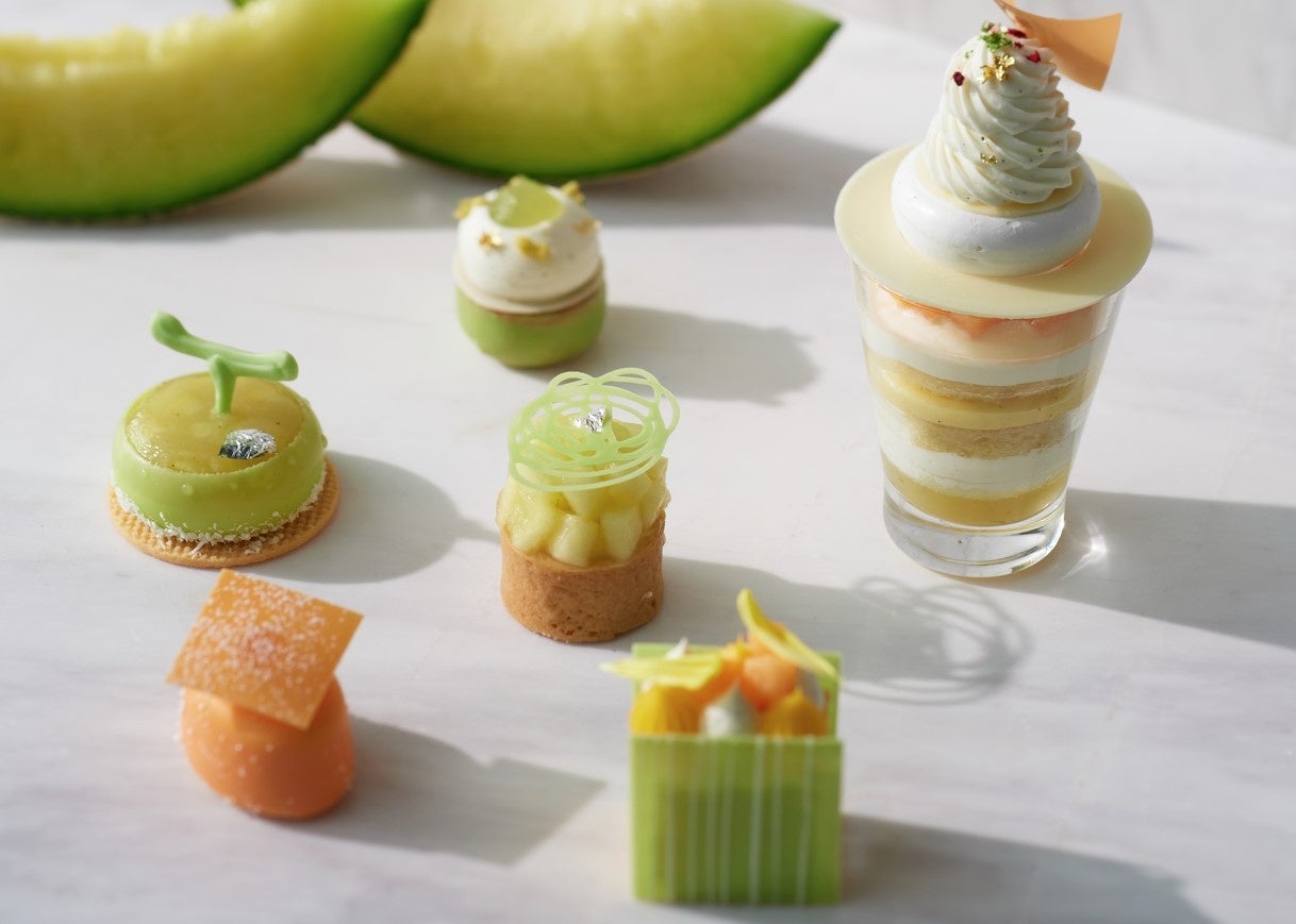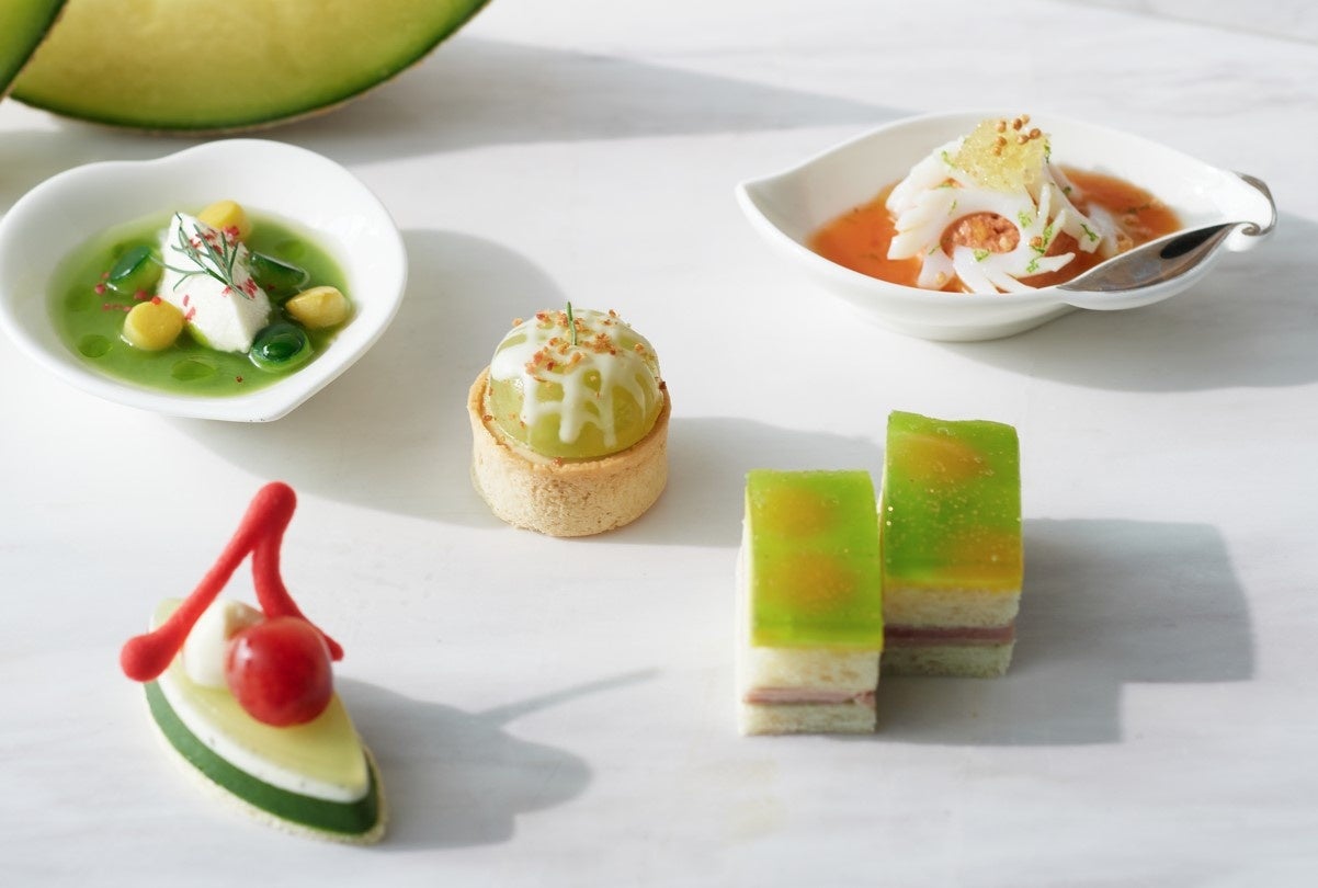 コクのある強い甘みに芳醇な香りの赤肉メロンと、爽やかで清涼感溢れる味わいが特徴の青肉メロン。この特徴ある2つのメロンのおいしさを芸術的なスイーツとセイボリーに昇華させたアフタヌーンティーはこの時季だけの特別なスイーツです。
