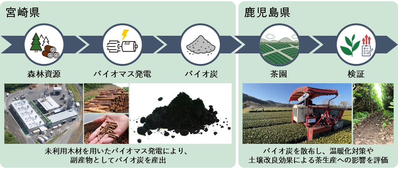 本試験では伊藤園が中心となり、上述の「バイオ炭」を同発電所近隣の堀口園及び鹿児島堀口製茶が展開する鹿児島県志布志市にある茶産地育成事業の茶園で試験的に散布し、茶園における温暖化対策効果を評価します。また、施肥的効果、副次的効果などを合わせて検証し、地域資源の循環体系構築と環境配慮型農業の確立による持続可能な茶農業の実現を目指します。