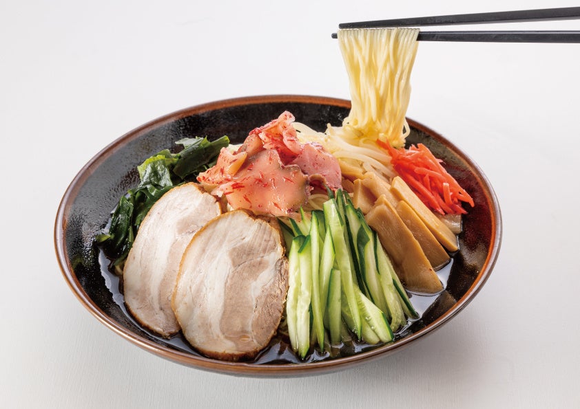 トッピングに定番のきゅうり、ヘルシーなワカメやもやし、今年度は自慢のチャーシューに梅味のさっぱりした梅ザーサイを使用し、色鮮やかでさっぱりとした夏の人気商品です。