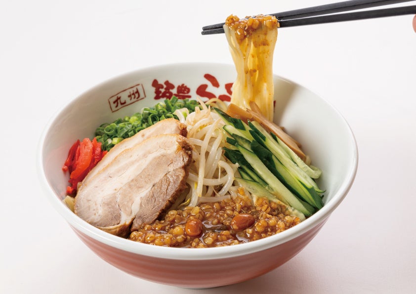 チャーシューやもやし、きゅうりなどをトッピングし特製のもろみ味噌をたっぷりかけることで、もろみ本来の大豆の食感と旨味が凝縮だれ、麺は福岡県産ラー麦を使用したツルリとしたのど越しのよい、平打ち太麺を2玉使用しました。