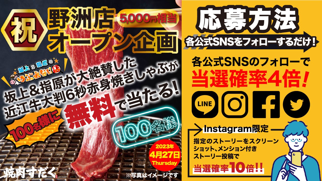2023年4月27日の焼肉すだく野洲店グランドオープンを記念して、公式SNSをフォローしてくださったお客様に「近江牛大判6秒焼きしゃぶ」を抽選で100名様に無料でプレゼント。