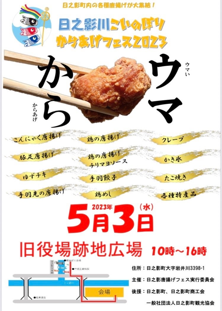 2023年5月3日(水)に、「日之影川鯉のぼり唐揚げフェス2023」が開催されます。唐揚げをメインに、全10事業者が選りすぐりのメニューで出店します!