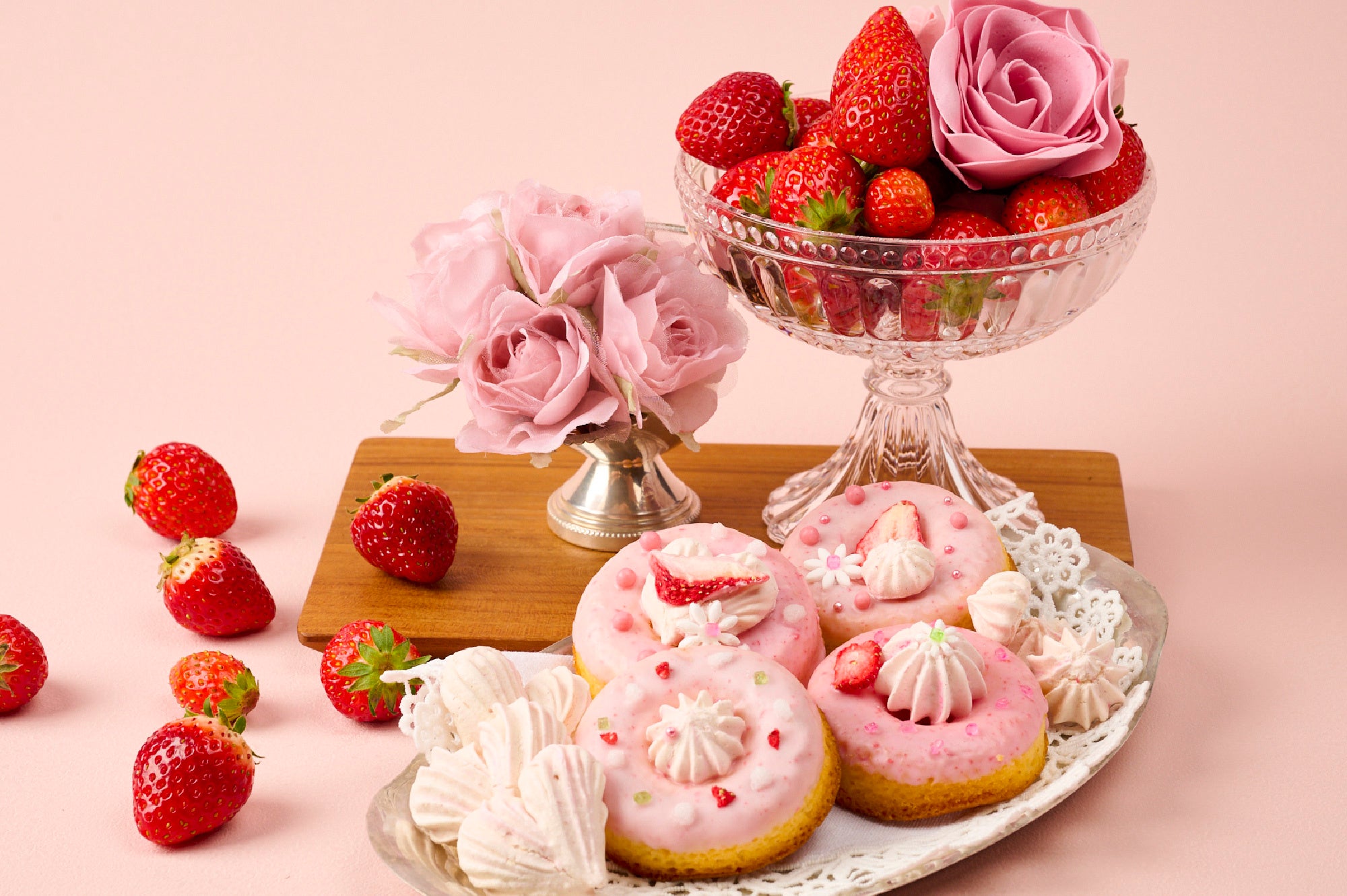 淡いピンク色でかわいくデコレーション、見た目も味もあまいドーナッツ。つぶつぶいちごチョコとフリーズドライいちごで飾り付けました。プリンセスなティータイムのお供にどうぞ。