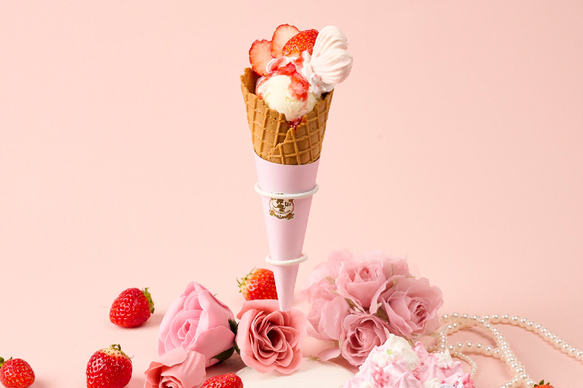プリンセスのバスケットをイメージしたいちごサンデー。ワッフルコーンを花かごに見立てて、真っ赤ないちごが華やかに咲き誇ります。一番上にちょこんと飾られたハートのいちごメレンゲもキュート!