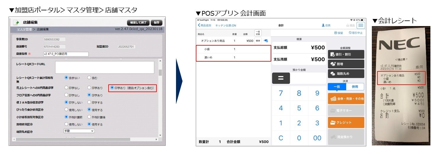 会計画面上でこれまで非表示だった0円の商品オプション明細について、会計画面への表示とレシートへの印字ができるようになりました。