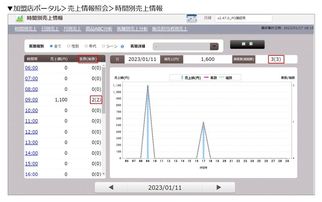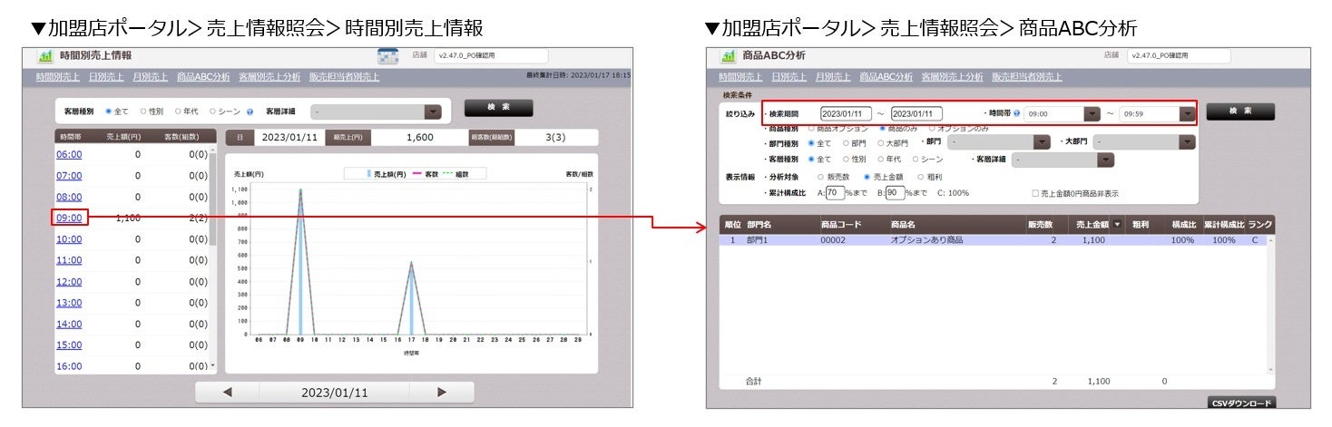 時間帯別売上画面上から、時間帯のリンクを押してABC分析画面に自動遷移できるようになりました。時間帯別の売れ筋商品の確認がスムーズになり、さらに、客数だけでなく来店数も表示されるようになります。