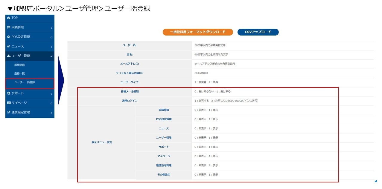 加盟店ポータルのユーザ一括登録時に表示メニューの制御設定等も指定できるようになりました。