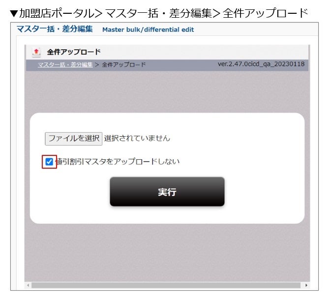 マスタ一括アップロード機能を使う際に値引きマスタファイル無しでもアップロードできるようになりました。同一ブランド店舗でも値引きマスタだけが店舗によって異なる場合に、値引きマスタは変えずにメニュー変更のアップロードを行うことができます。