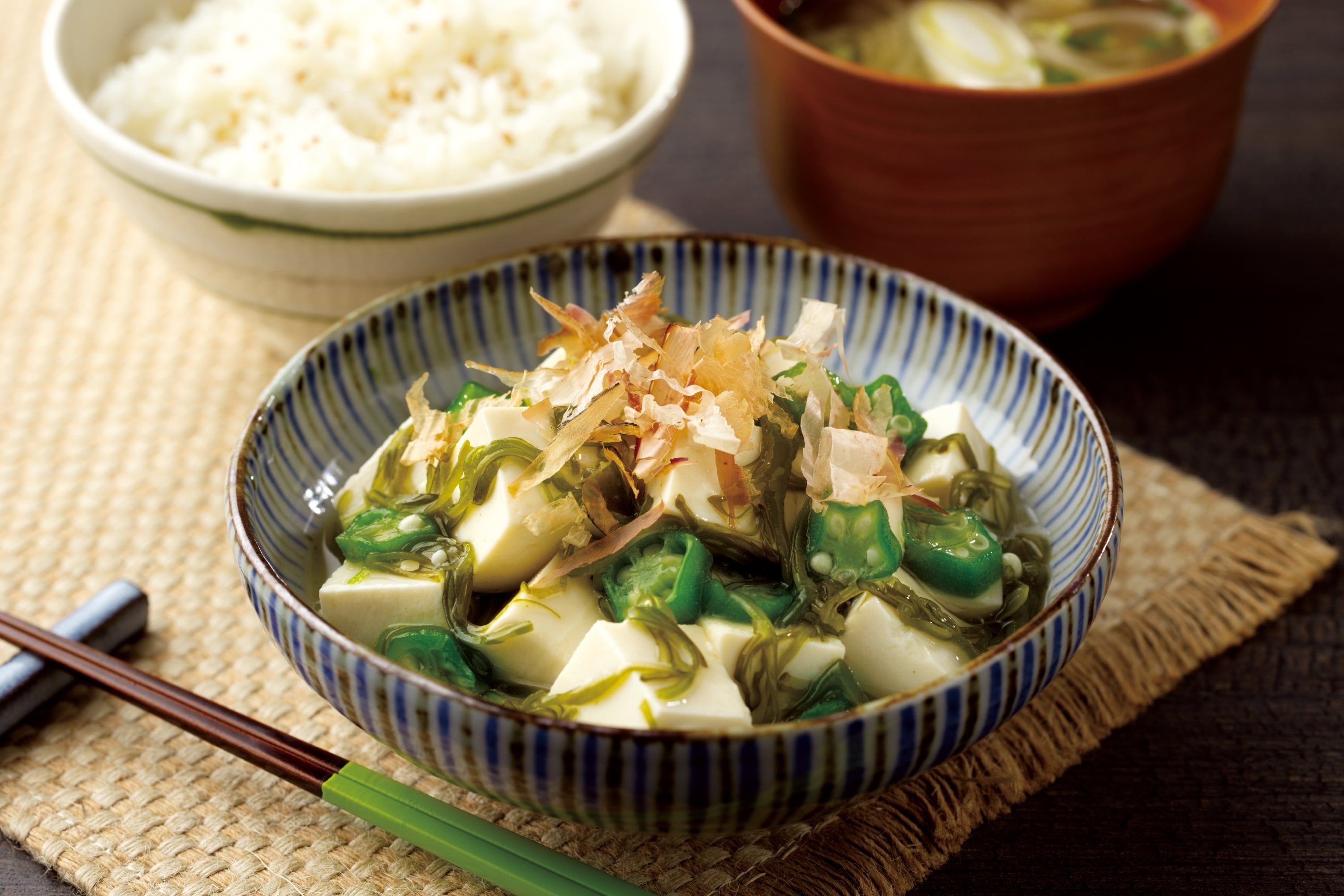 三陸産のめかぶは香りや食感が良く、食べ応えのある豆腐と一緒にねばねば食材のおくらと絡めて、さっぱりと食べられる一品に仕上げました。