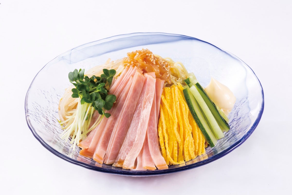 毎年恒例・大阪王将の『五目冷やし中華』は、王道のさっぱり醤油味。冷たい麺を飾るのは、きゅうり・錦糸玉子・ロースハム・もやしナムル・中華くらげ・かいわれの全6種。具だくさんで栄養満点、彩り豊かでおいしさも広がります。マヨネーズで味変もお楽しみください。