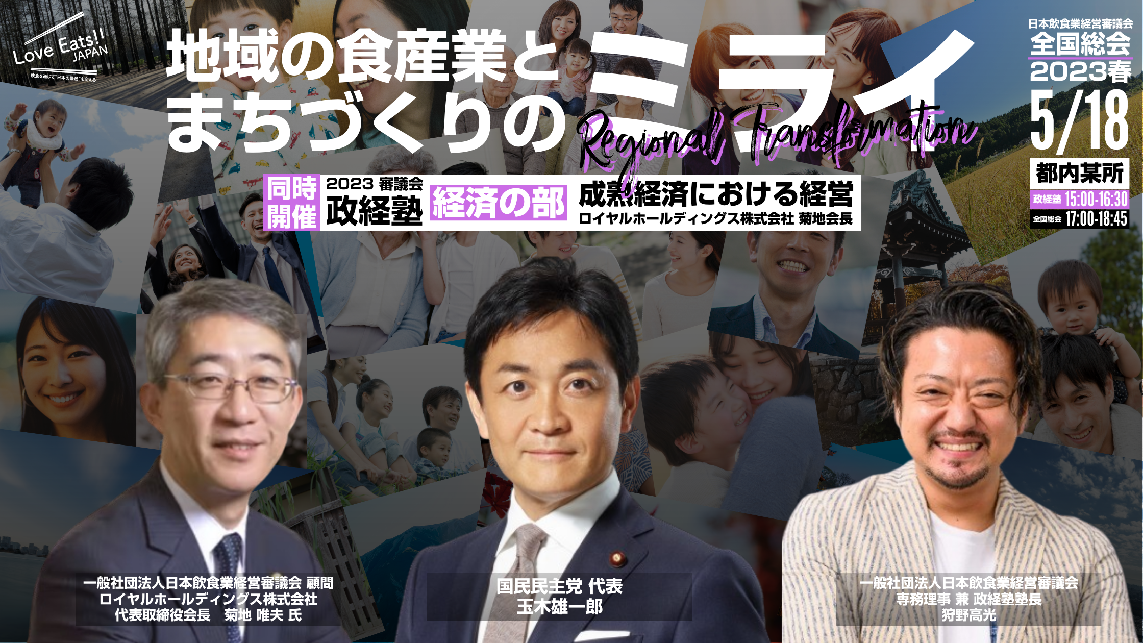 また、衆議院議員であり、国民民主党代表 玉木雄一郎氏とロイヤルHD代表取締役会長 菊地唯夫氏、日本飲食業経営審議会専務理事 狩野高光によるトークセッション「地域の食産業とまちづくりのミライ〜Regional Transformation〜」を予定しております。