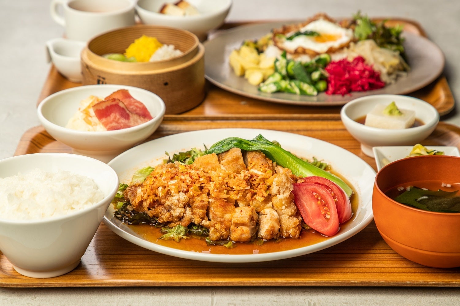5月限定ランチの他にお勧めなのは日替わり定食「黒酢の油淋鶏」。黒酢ベースの薬味ダレでいただく野菜たっぷり中華ランチです。ポテトサラダ、とろろ豆腐、ご飯、お味噌汁、お漬物と一緒にお召上がりください。
