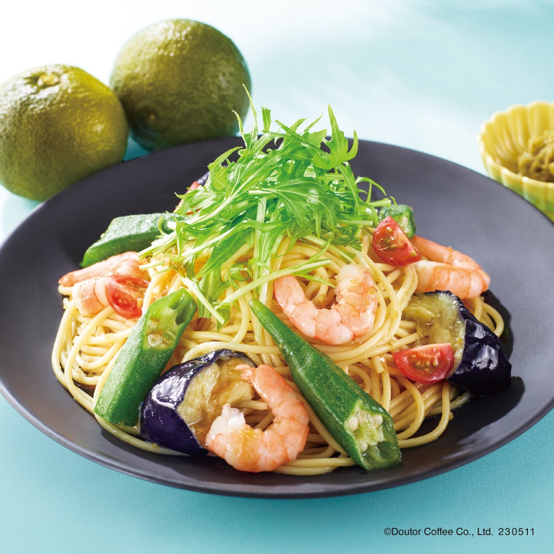 オクラ、揚げなす、ミニトマト、水菜の4種類の野菜を合わせ、具材感を感じていただけるように仕立てました。ソースにはだし醤油とバターを使用し、コクとまろやかさをプラス。さらに、柚子胡椒を加えることで、爽やかな香りとピリっとした辛味が食欲をそそる、暑い時期でもさっぱりと食べられる一品です。