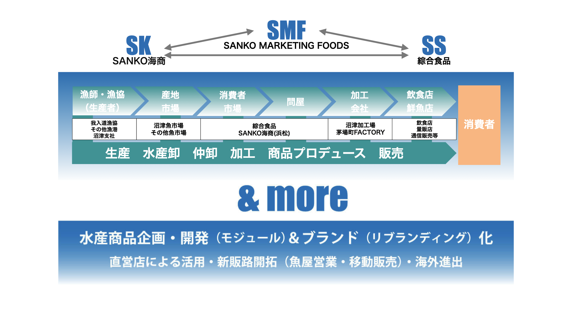 当社が取り組む水産事業において、浜松・沼津・下田・豊洲が整いました。6次産業化とは、1次産業を担う農林水産業者が、自ら2次産業である加工や、3次産業の販売・サービスを手掛け、生産物の付加価値を高めて農林漁業者の所得を向上する取り組みを指します。