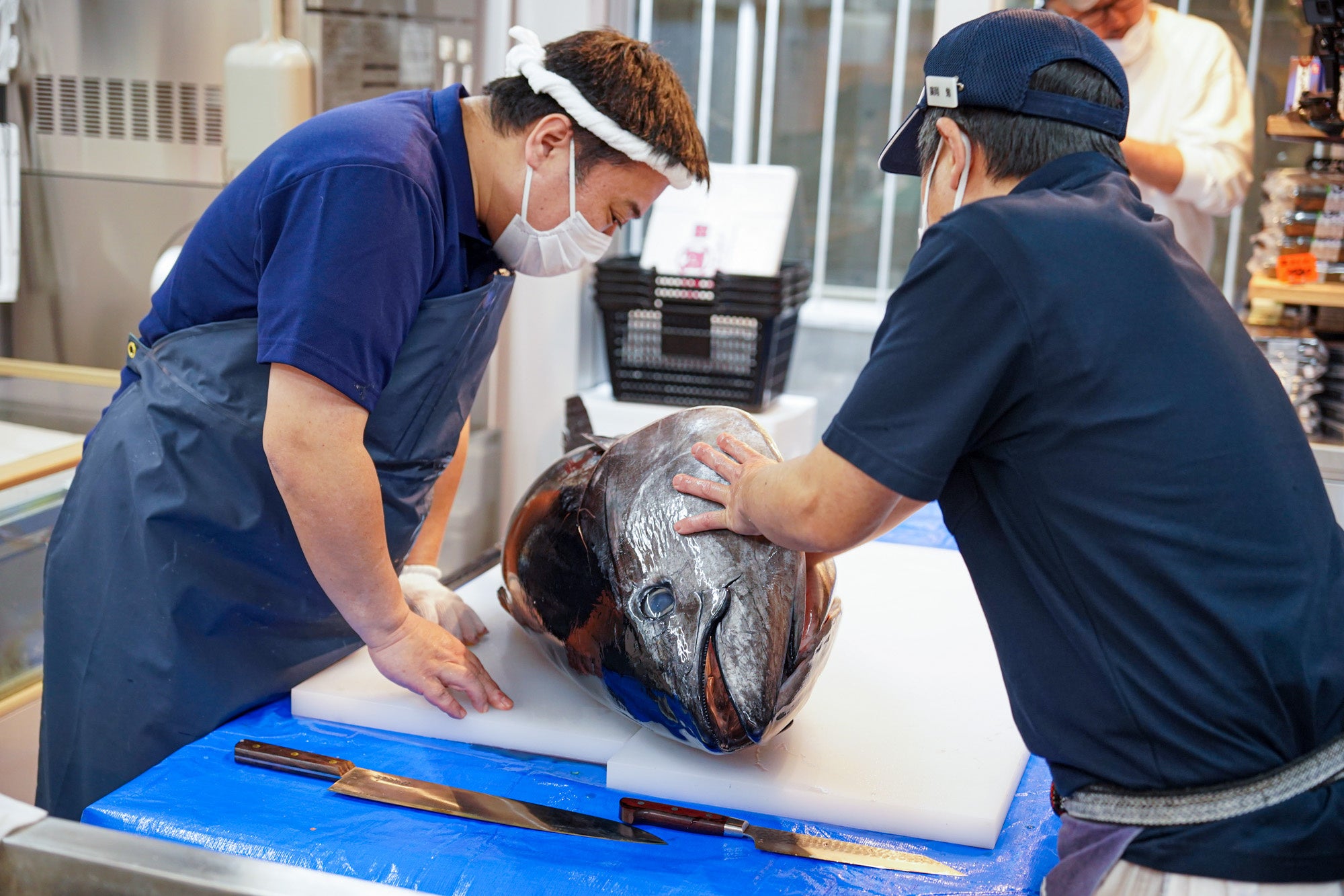 当社のまぐろ目利き職人が選んだまぐろを捌く様は、迫力満点!