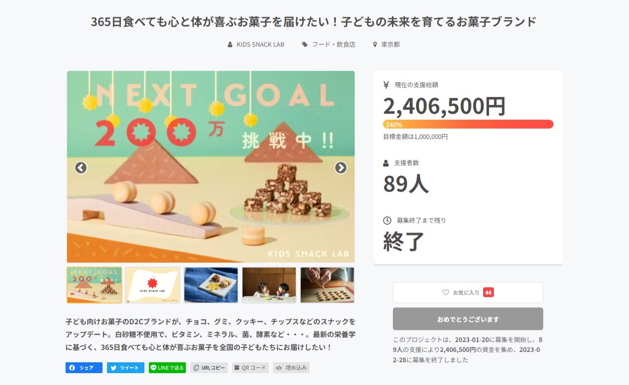 今年1月20日(金)よりCAMPFIREにて実施したクラウドファウンディングでは、開始2日で支援総額が100万円を突破し、最終的には目標金額の240%を超えるご支援をいただきました。ご支援いただいた方からは「孫へ気兼ねなく与えられる、安心で安全なお菓子に元々興味があった」「共働きで忙しい中でも、子どもにとって良いお菓子を手軽に食べさせたい」「子どもにとって悪いものが入っていない、かつ体が健康になるお菓子が一般的なものになれば、多くの保護者にとっての救いになるはず」などのお声をいただき、世間のみなさまの子ども向け栄養機能お菓子に対する興味・関心の高さを実証できた結果となりました。