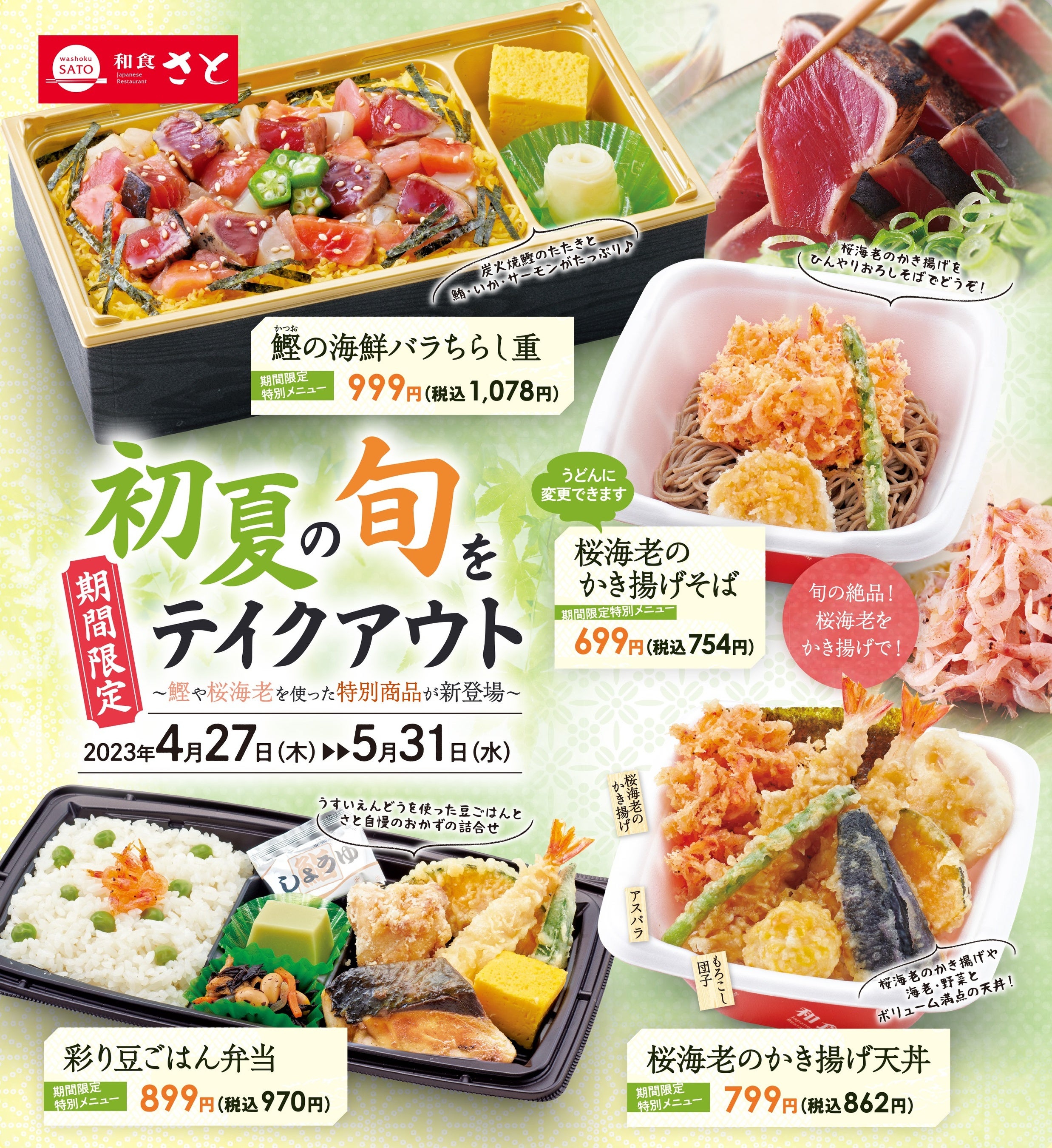 国内197店舗を展開する「和食さと」では、焼津港水揚げの炭火焼「鰹のたたき」を使用した「鰹の海鮮バラちらし重」や、旬の桜海老を使った「桜海老のかき揚げそば」「桜海老のかき揚げ天丼」など、初夏限定のテイクアウトメニューを4月27日(木)より販売開始します。