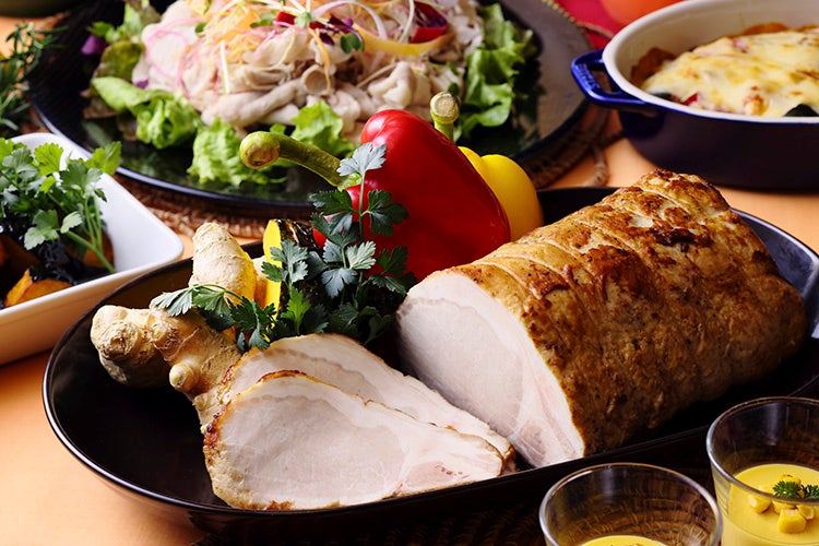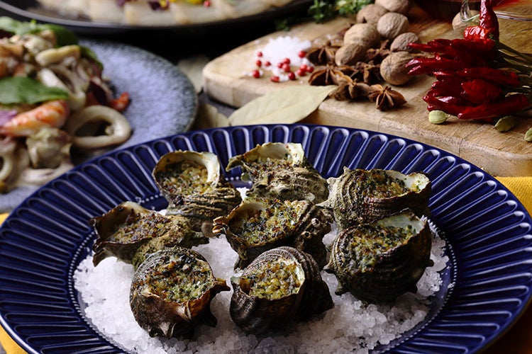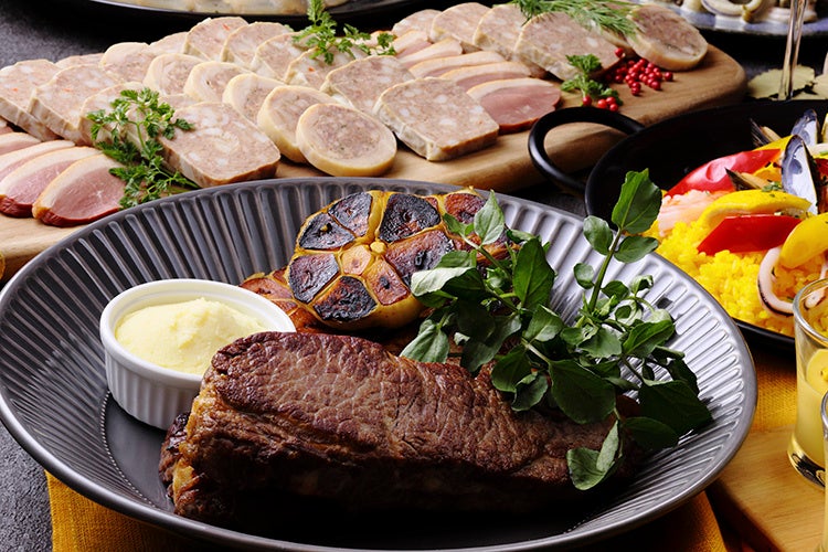 ディナービュッフェのメインディッシュ「牛肉のステーキ」は、パンチの効いたガーリック醤油で。「サザエのブルギニオン風」は香草とガーリックバターの風味が食欲をそそる一品。また、ランチ・ディナー共通でお楽しみいただける「ローストポーク ジンジャーソース」は、柔らかく旨味が凝縮された豚肉とさっぱりした生姜の相性が抜群です。