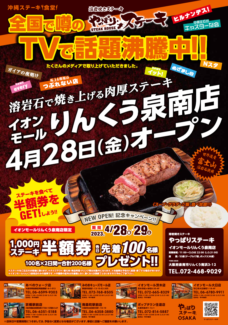 この度、大阪府に「やっぱりステーキ イオンモールりんくう泉南店」が4月28日(金)にオープン致します。