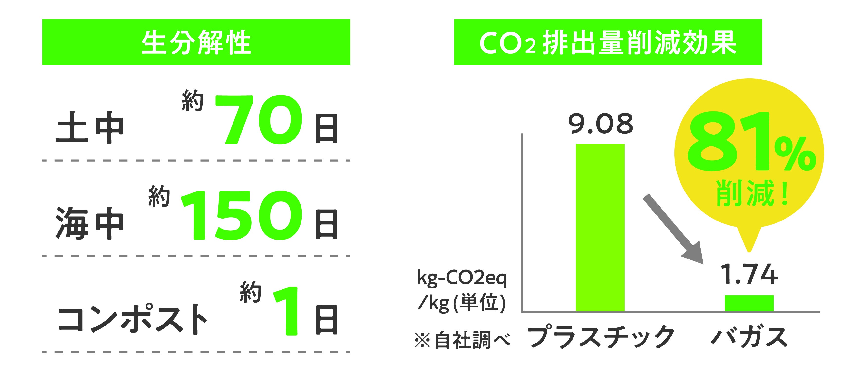 バガスシリーズは廃棄される植物の有効活用だけではなく、海や土壌、コンポストで分解する特長があるほか、プラスチックと比べ、LCA の観点から 80%以上の二酸化炭素排出量削減効果が期待できる、エコロジカルな包材です。