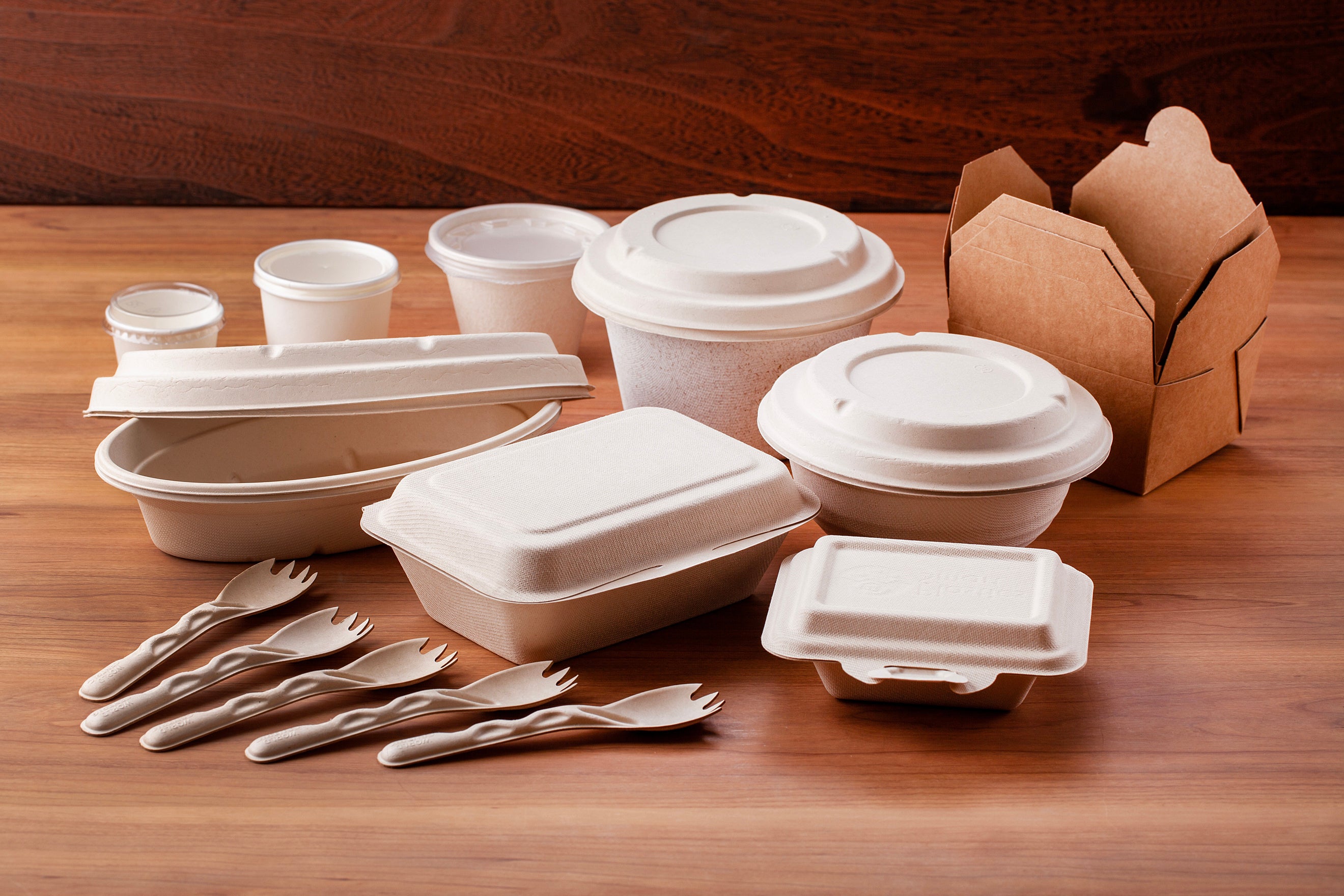 サトウキビから糖汁を絞った後の圧縮カスであるバガスや従来の紙容器、また、滲出防止が必要な汁物などの商品には植物原料由来プラスチックのバイオマスや生分解性プラスチックなどの蓋を合わせる「エコ包材」を使用します。持ち運びの機能性と食事のしやすさを兼ね備えた、エコ資材に注力する株式会社折兼の容器を採用いたしました。
