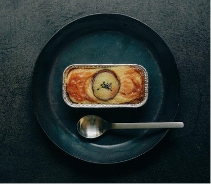 「焼き芋のテリーヌ」は焼き芋本来の甘さを引き立たせることを1番に考えました。作り方としては焼き芋の皮を剥きミキサーにかけることで、独自の食感に仕上げました。砂糖・バター・少量のブランデー・卵黄・生クリームを合わせて型に絞って流し込み、色付けのために卵黄とコーヒーエキスを塗って焼き上げています。また見た目でも楽しんでもらえるように蒸した輪切りの芋を添えています。