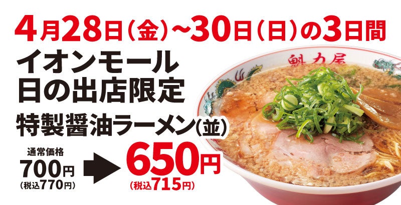 この度オープンを記念して、「イオンモール日の出店」にご来店いただいたお客様には、『特製醤油ラーメン(並)』を650円(税込715円)で販売いたします。