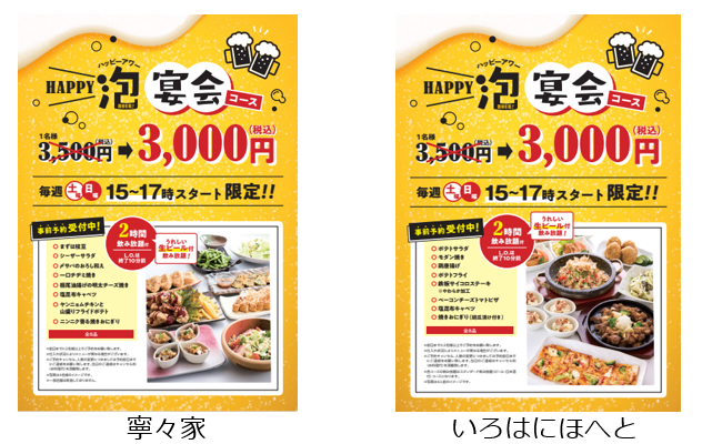 ※寧々家はランチ営業店舗を除く24店舗で実施。いろはにほへと・やきとりセンターにつきましては、(株)アトム運営店舗が実施となります。