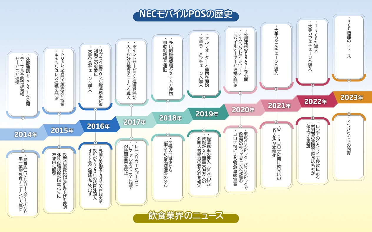 現に、「NECモバイルPOS」の特徴である『サブスク型POSであるにもかかわらずフィールドサポートも手を抜かない』や『周辺サービスとの連携先の多さ』という特徴は、そうした声を反映して生まれています。その意味で、NECモバイルPOSは飲食業界の歴史と共にあるといっても過言ではありません。