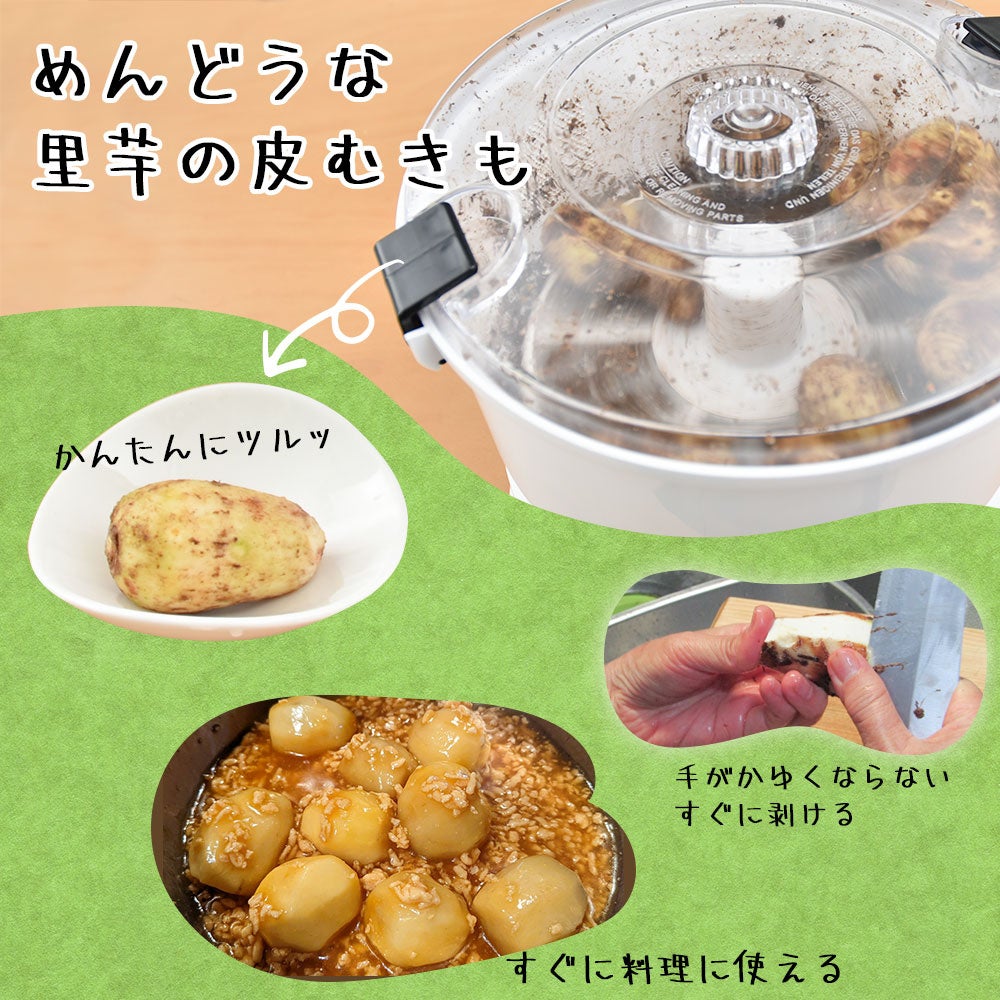 直径260×高さ270mm。さっと水につけたじゃがいもを本体に入れ電源を入れると、本体内のブレードプレートが回転。1分あたり400~600回の回転でじゃがいもの皮を削り、約2分でじゃがいもの皮を自動でむきます。(電源スイッチは手動でオフ)。最大容量は1kg(じゃがいも5~10個)。じゃがいもの皮だけでなく里芋の皮むきにも使用可能。