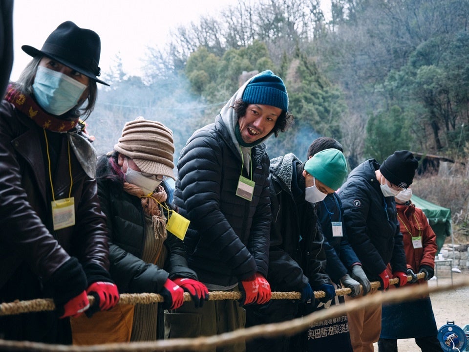 約6メートルの竹に荒縄を巻きつけていくのは、見た目以上に大変な作業。参加者が一列になって竹をひたすらに回し続け、何十回、何百回と回し続けるうちに腕がパンパンになっていきます。黙々と作業をするのは辛いですが、自然と声をかけあっていれば、ライブ会場さながらの盛り上がりになることも。