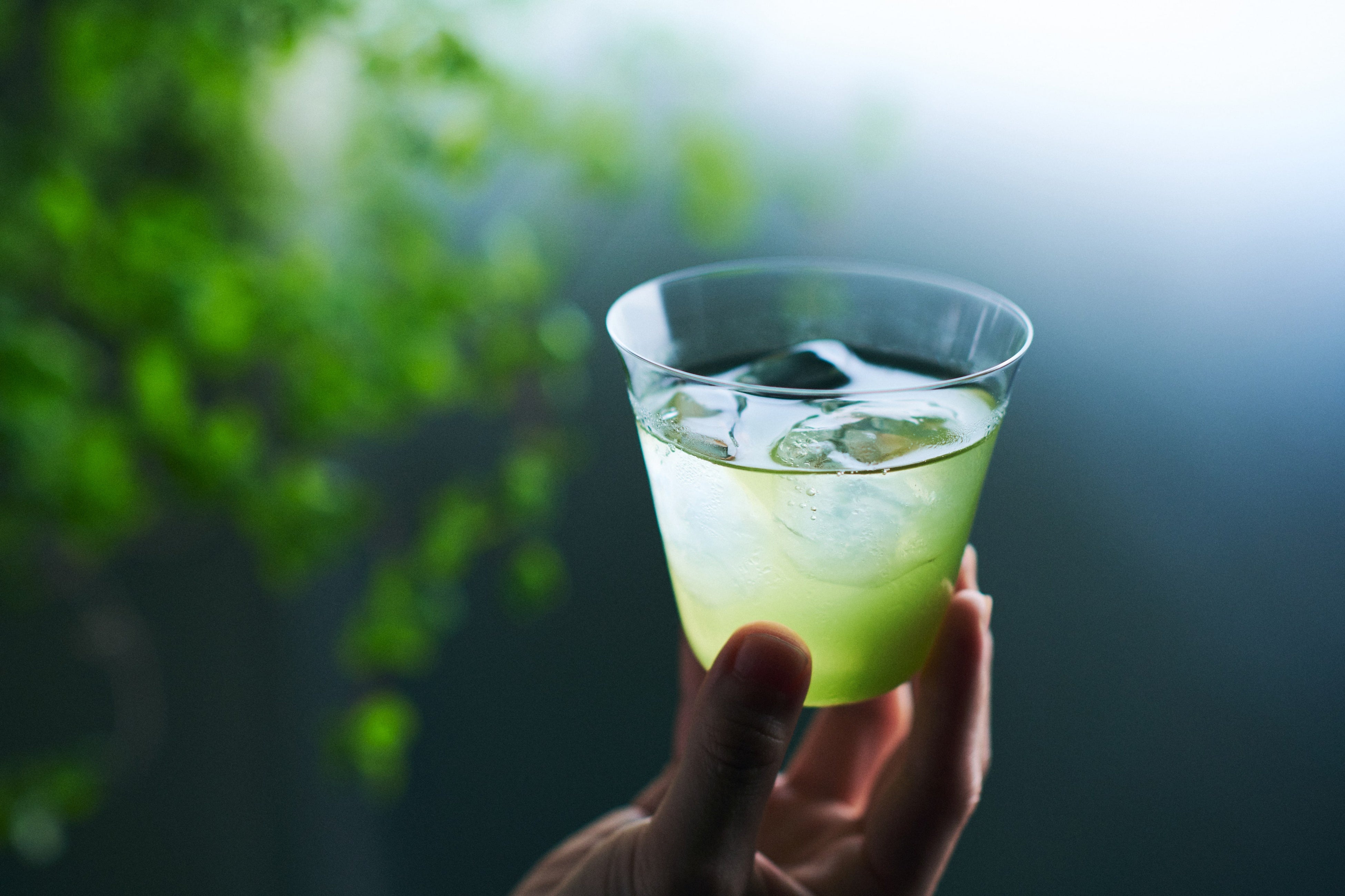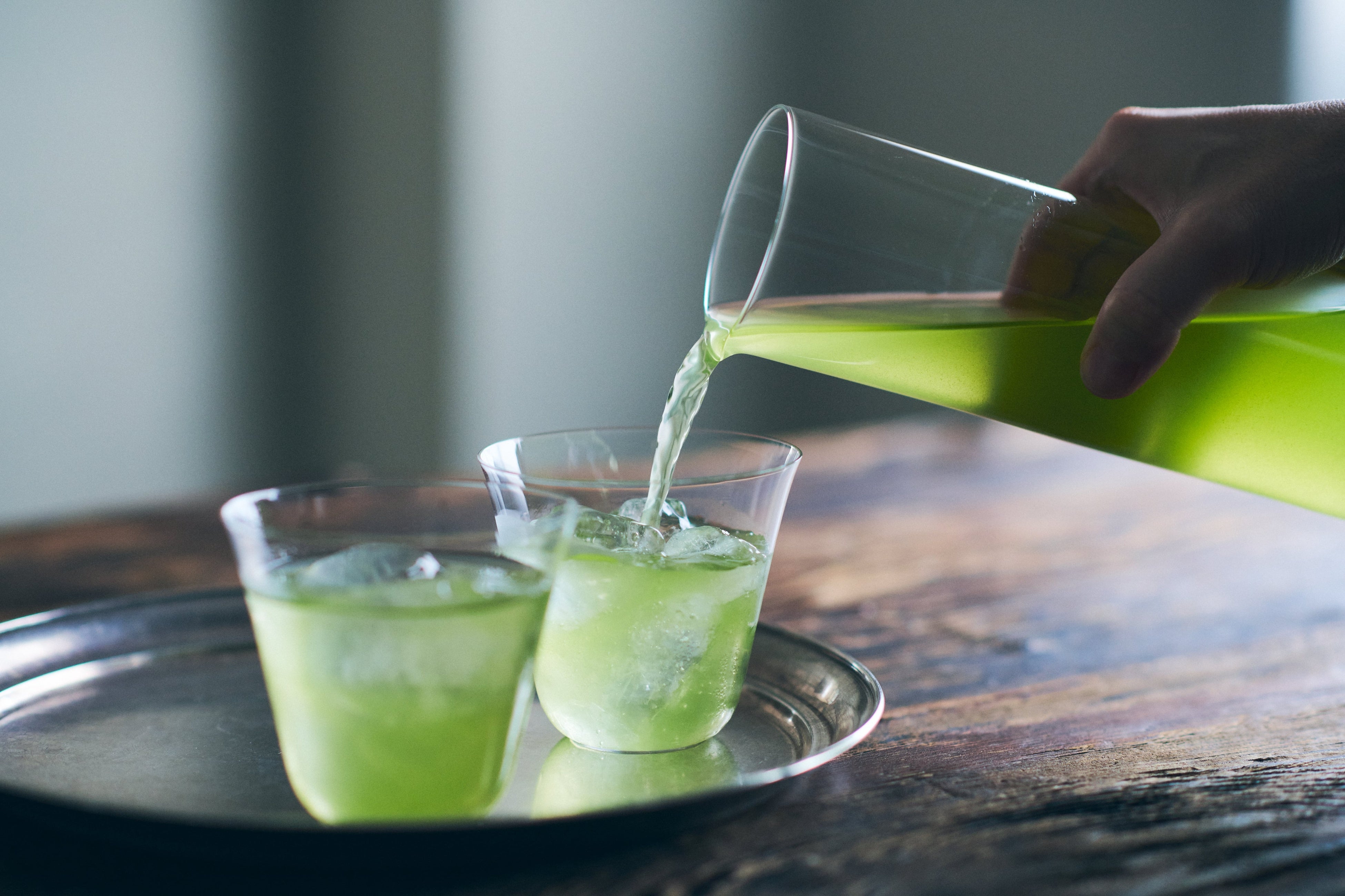 深蒸し茶とは、緑茶の製造工程のひとつである「蒸し」の時間を通常より長くとったお茶のこと。しっかりと蒸されることで茶葉が細かくなり、表面積が広がって抽出性があがるので、水で出しても旨みが濃厚に溶け出します。そこに石臼挽き宇治抹茶をブレンドすることで、見た目で涼を誘う鮮やかなグリーンを実現。京都の老舗米菓舗「鳴海屋」特製の「備長炭炭火炒り餅」のやさしい香ばしさはそのままに、夏限定の味わいが完成しました。キリっと冷えた水出し茶は、気温がアガルほどおいしくて、いっそう気分がアガル! 夏こそ飲みたい玄米茶です。