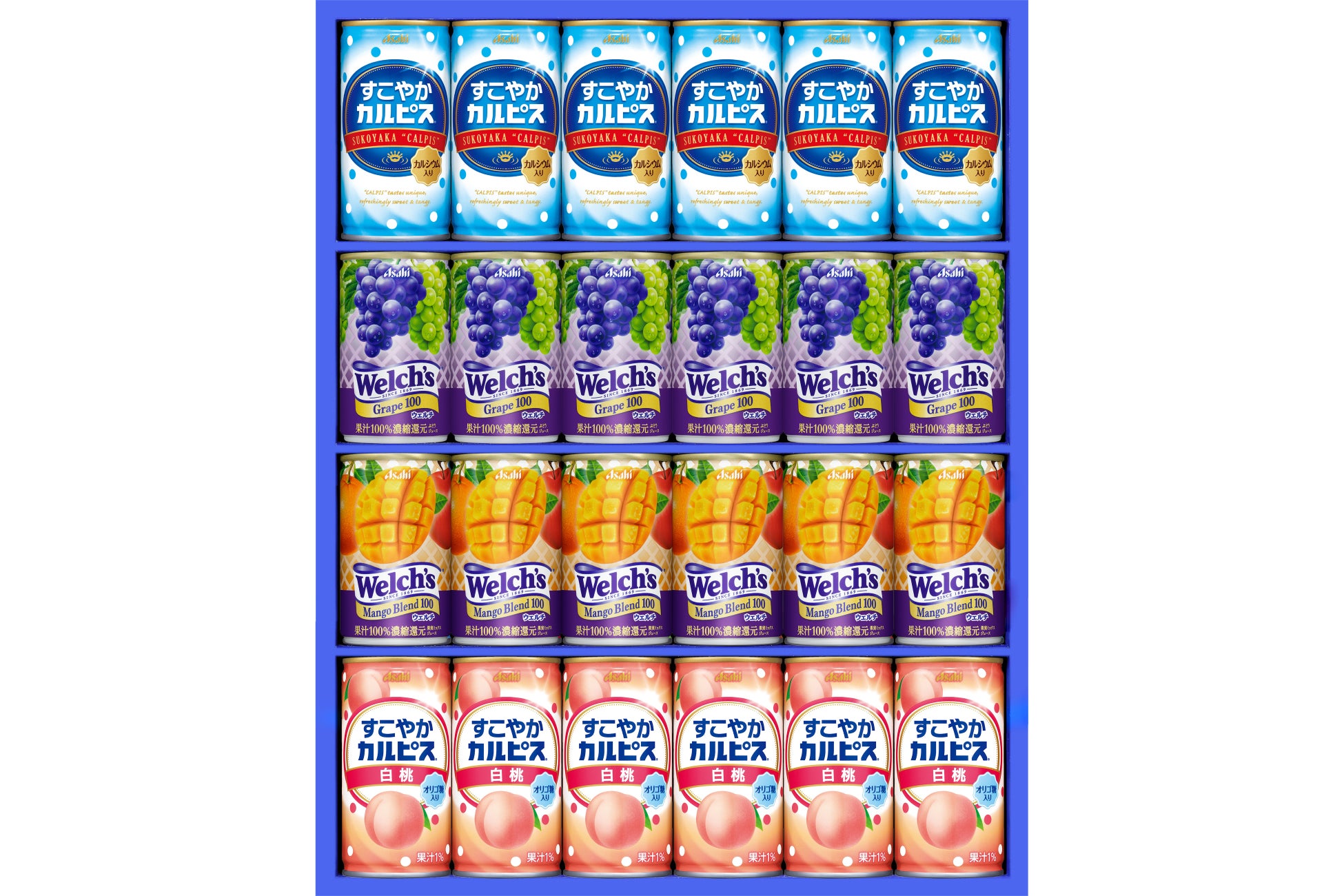 すこやか素材を加えた、そのままお飲みいただけるタイプの「すこやかカルピス」と、おいしさと品質にこだわり続けている、濃厚で上質な味わいが魅力の「Welch’s」100%果汁ジュースを詰め合わせたバラエティ豊かなギフトセットです。