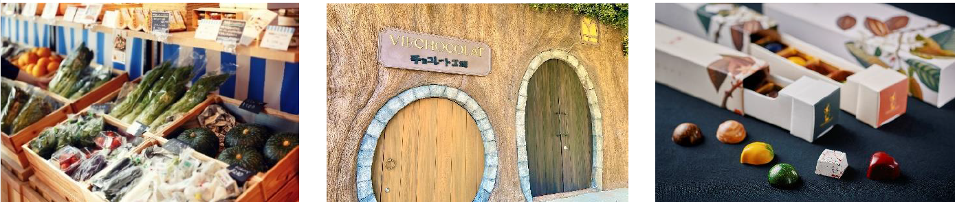 本施設は、ヨーロッパのようなカラフルな街並みを再現しており、寿司・串揚げ・おばんざい・火鍋などのメニューを淡路島の豊富な食材で楽しめるレストランや、採れたての野菜や加工品を販売するマルシェを開設。また、チョコレート専門店「VIE CHOCOLAT(ヴィ ショコラ)」では、ヴィーガンチョコレートのほか、特例子会社パソナハートフルで働く障害を持ったメンバーが手作りした高カカオや低糖の体にやさしいチョコレートを販売いたします。